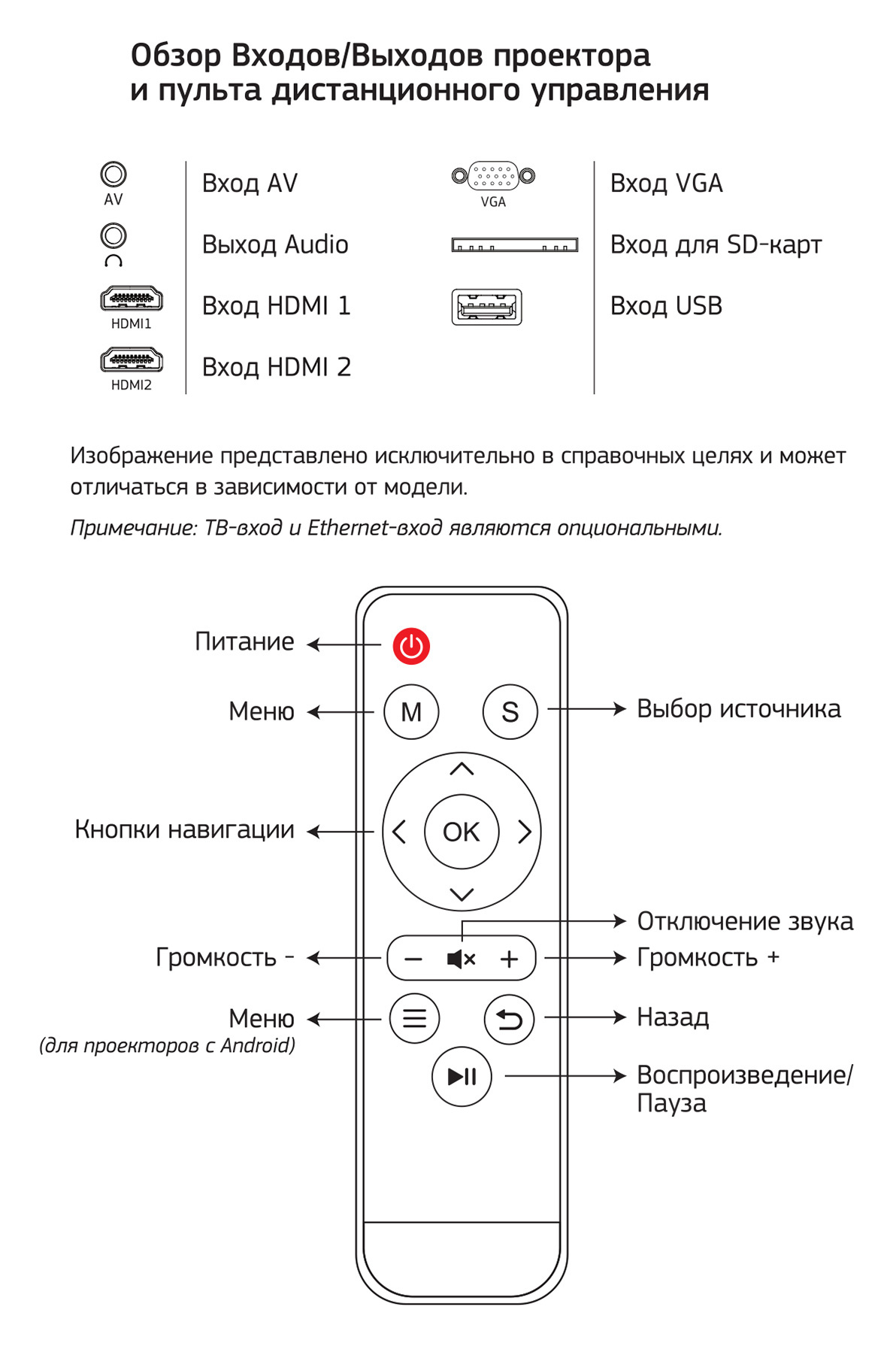 | Комплектация | кабель HDMI 1.5м, 3,5 мм кабель AV, кабель питания, пульт ДУ, салфетка из микрофибры, руководство пользователя | |