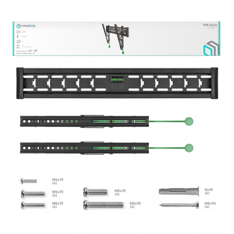 Настенный наклонный кронштейн ONKRON TM6 предназначен для телевизоров с диагональю от 43 до 85 дюймов (109,2-215,9 см).