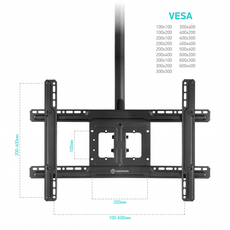 Кронштейн подходит для крепления панелей с множеством размеров VESA – 100x100, 100x200, 200x100, 200x200, 200x300, 200x400, 300x100, 300x200, 300x300, 300x400, 400x200, 400x300, 400x400, 500x400, 600x200, 600x300, 600x400 мм.