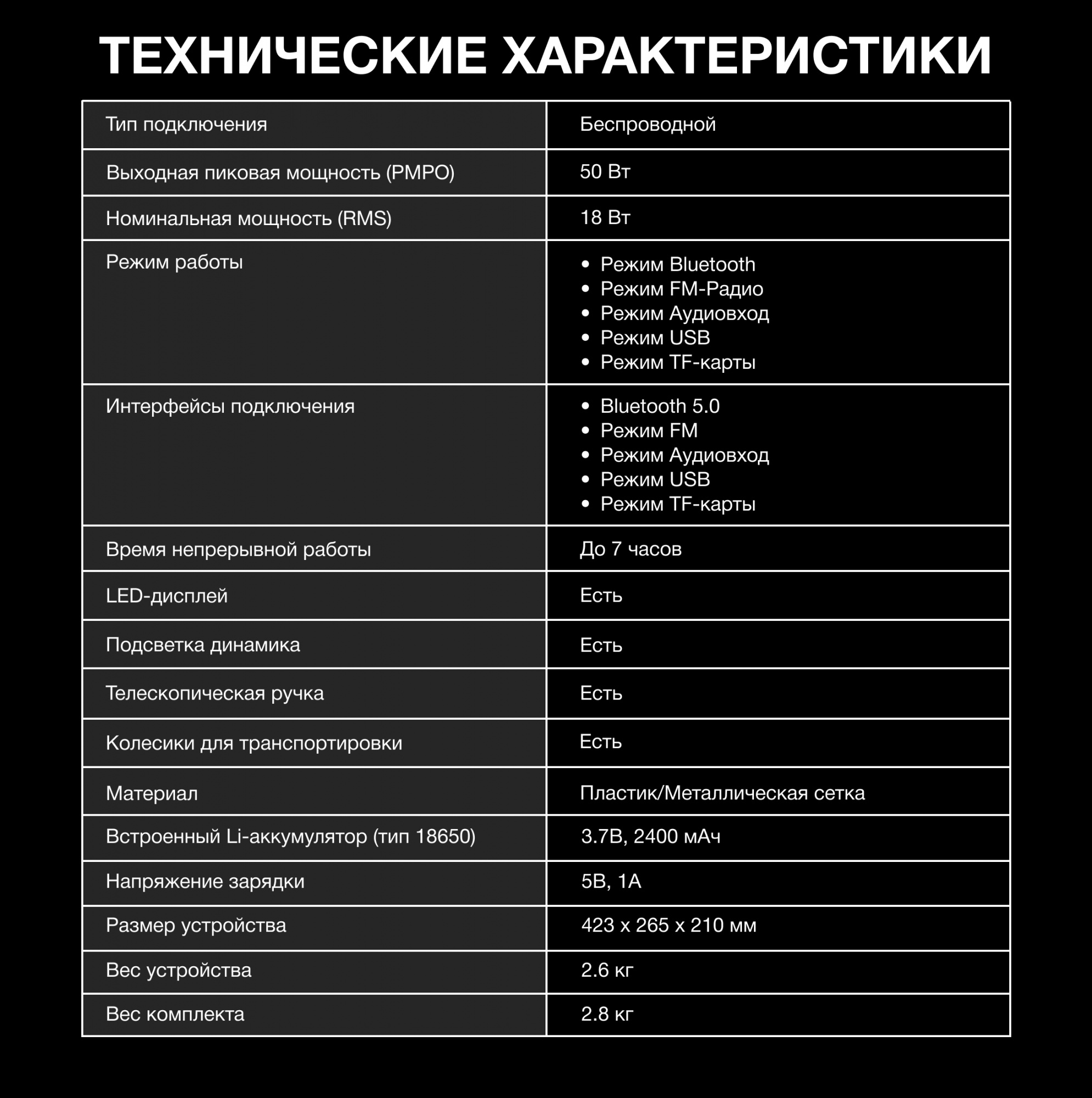 | Комплектация | AUX кабель, USB кабель, пульт, проводной микрофон | |
