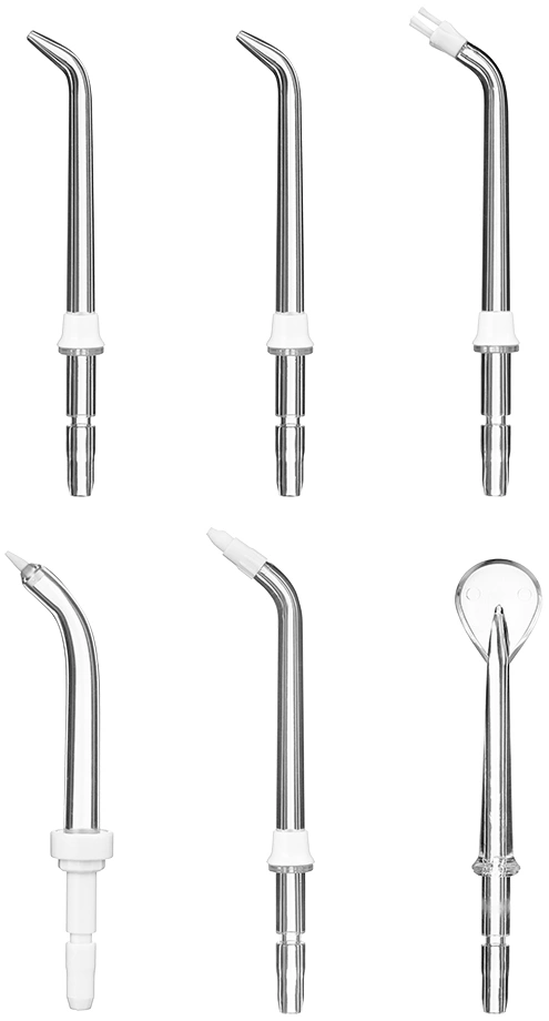| Особенности | В комплекте идут различные насадки: 2 классические струйные насадки, насадка для удаления зубного камня и налёта из-под линии десны, насадка для ортодонтических конструкций, насадка с щёточкой для удаления налёта, насадка для чистки языка. | |