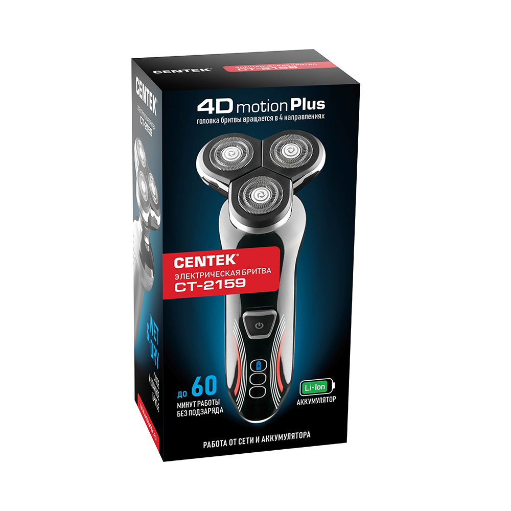 Бритва Centek CT-2159 – это беспроводная бритва роторного типа с тремя независимыми головками. Гибкие головки изготовлены из специального сплава, который отличается повышенной прочностью, устойчивостью к химическим веществам и мягким скольжением. Независимая подвеска каждого элемента бритвенной системы и плавающая головка, вращающаяся в четырех направлениях, обеспечивают максимальный контакт для более гладкого бритья. Бритва подходит для сухого и влажного бритья. Энергоэффективный Li-Ion аккумулятор емкостью 600 мАч обеспечит автономную работу устройства до 60 минут, что позволит брать ее в поездки и путешествия. Бритва работает как от сети, так и от аккумулятора, обладает мощностью 5 Вт и оснащена LED-индикатором зарядки. Электробритва имеет стильный внешний вид и удобно лежит в руке, что позволяет бриться с комфортом. Качественно сделанная бритва будет долгие годы радовать вас и позволит создавать завершенные образы.