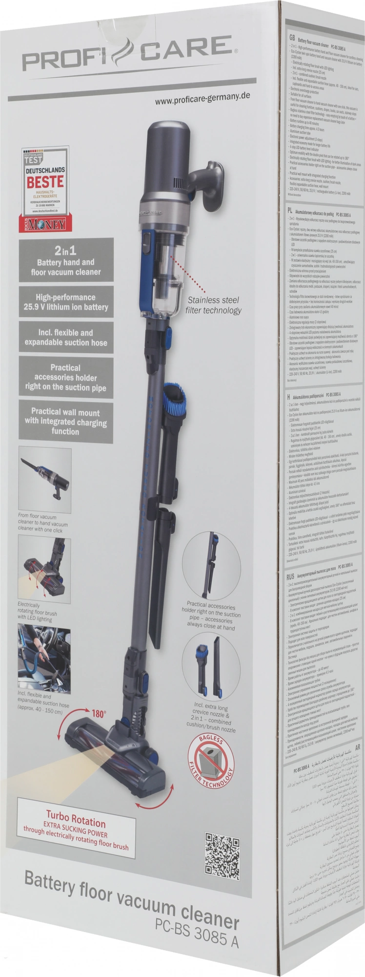 | Особенности | Аккумуляторный напольный и ручной пылесос Eco-Cyclon-Twin-Spin.Подходит для всех поверхностей.Встроенный режим ECO для увеличения срока службы батареи.Держатель принадлежностей на трубе. | |