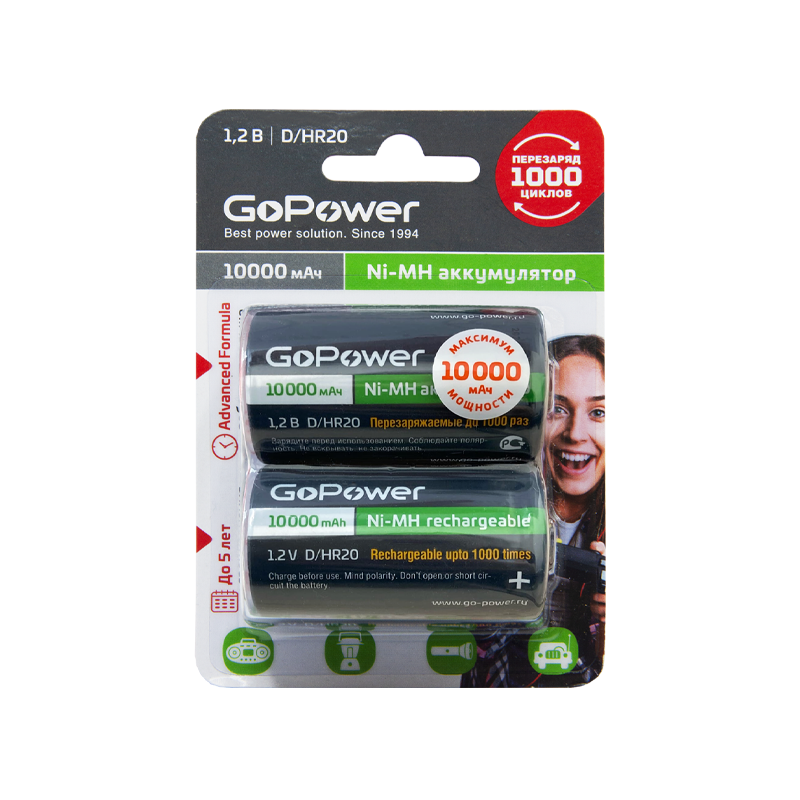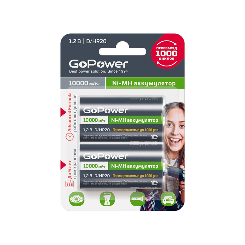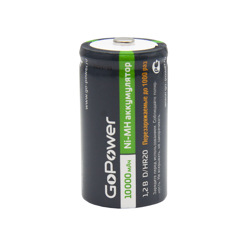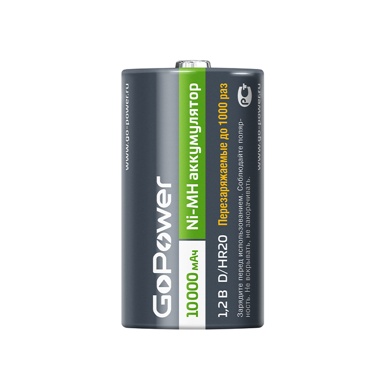 Ni-MH аккумулятор размера D/НR20 емкостью 10000 мАч. Если вы часто покупаете батарейки, переходите на Ni-MH аккумуляторы GoPower! Ni-MH аккумуляторы GoPower перезаряжаемы до 1000 раз и заменят батарейки во всех современных устройствах, они сэкономят деньги и не навредят окружающей среде. Производятся по улучшенной технологии с использованием премиальных компонентов, что гарантирует продолжительный срок службы 1000 циклов и сниженный саморазряд.