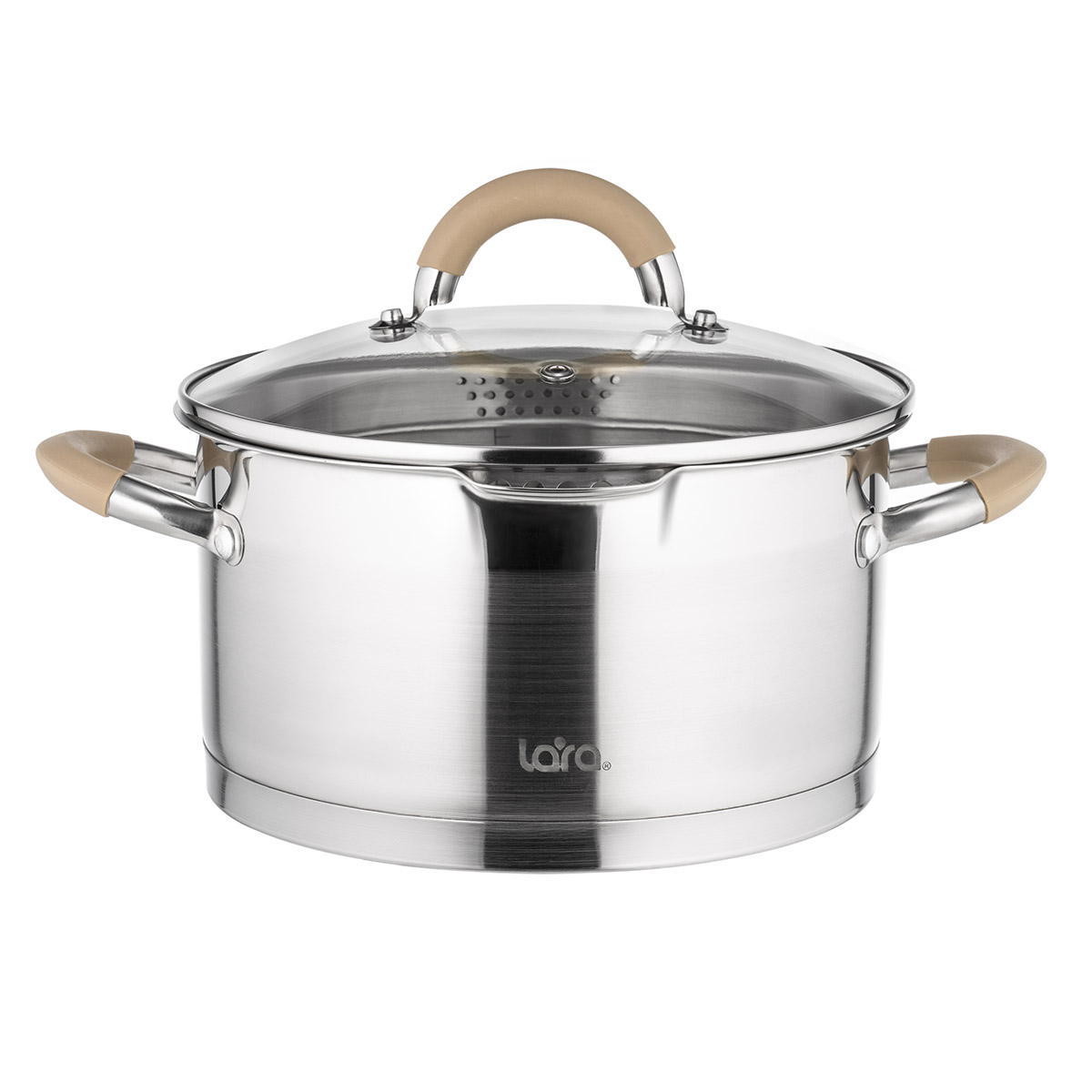 LR02-514 Кастрюля LARA (нерж) BOHEMA 24x13.5см 5.1л, крышка-дуршлаг (3/6мм), носик