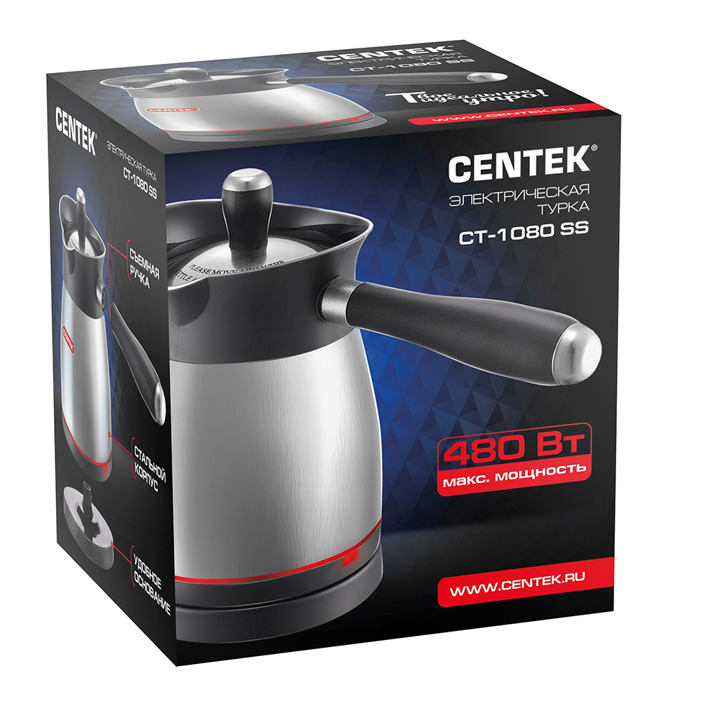 Электрическая турка Centek СТ-1080 – стильное и современное решение на вашей кухне. Фактурный корпус выполнен из высококачественного пластика и нержавеющей стали – не подвергается коррозии, не влияет на вкусовые качества воды и легко очищается от загрязнений. Нагревательный элемент скрытого типа обеспечит надежную и комфортную эксплуатацию прибора и быстрое закипание воды. Удобная форма сливного носика для аккуратного переливания содержимого. Шкала уровня воды. Объем емкости – 500 мл. За один раз можно приготовить 2 чашки кофе. Высокая мощность – 480 Вт. Вскипятить 0.5 литра воды можно за считанные минуты. Турку можно использовать и для быстрого подогрева небольшого объема воды.