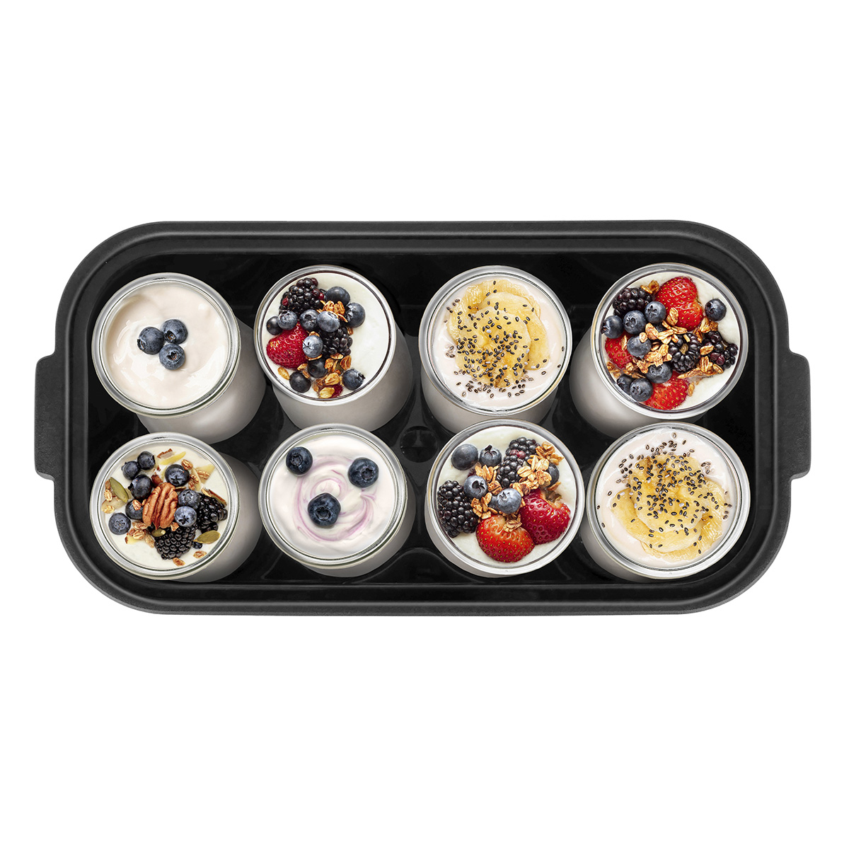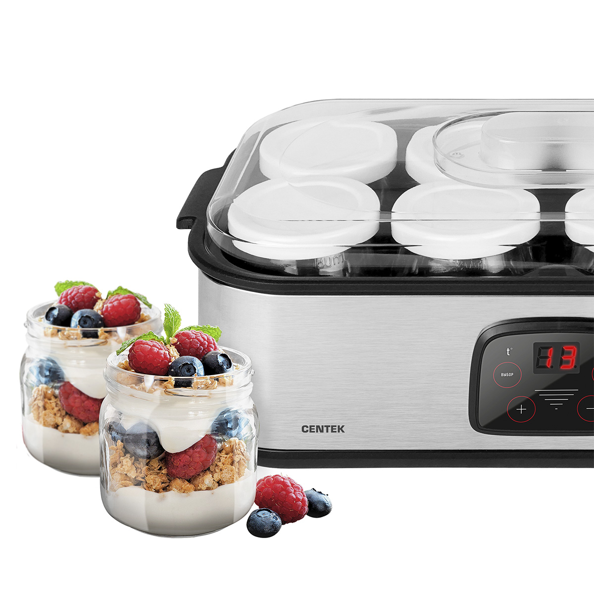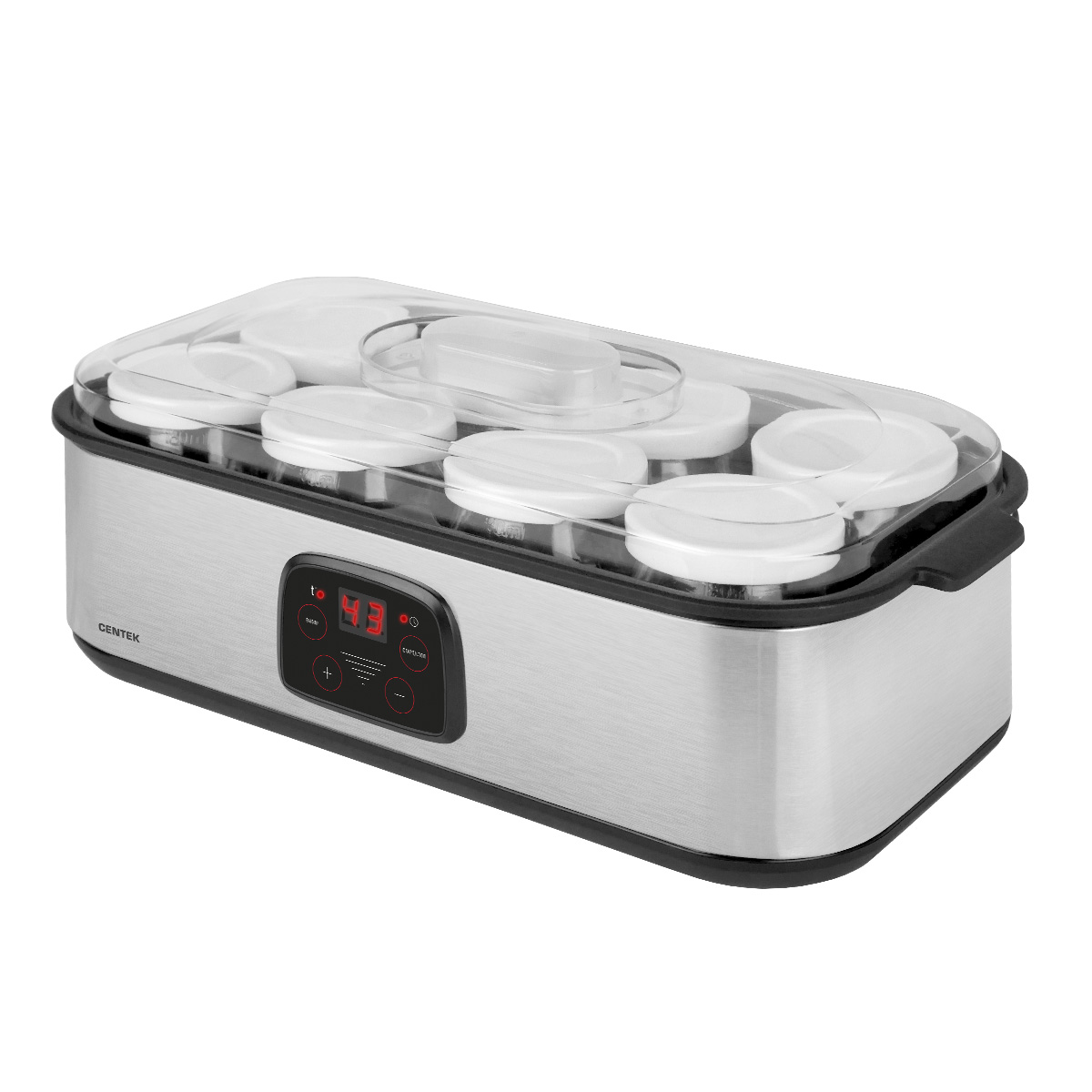 Йогуртница Centek CT-1443 для приготовления живых йогуртов, кефира, ряженки, простокваши, сыра и других кисломолочных продуктов в домашних условиях без красителей и консервантов. В комплект входят 8 стеклянных баночек с крышками, каждая баночка объемом 200 мл. Эргономичный стальной корпус с прозрачной крышкой, электронное управление и таймер со звуковым сигналом по окончании приготовления делают использование йогуртницы максимально простым и комфортным. Мощность йогуртницы – 30 Вт, контроль температуры от 20 до 55°С. Возможность приготовления йогурта, кефира, сметаны, простокваши, ряженки, мацони и домашнего сыра. Подходит для приготовления кисломолочных продуктов для детей.
