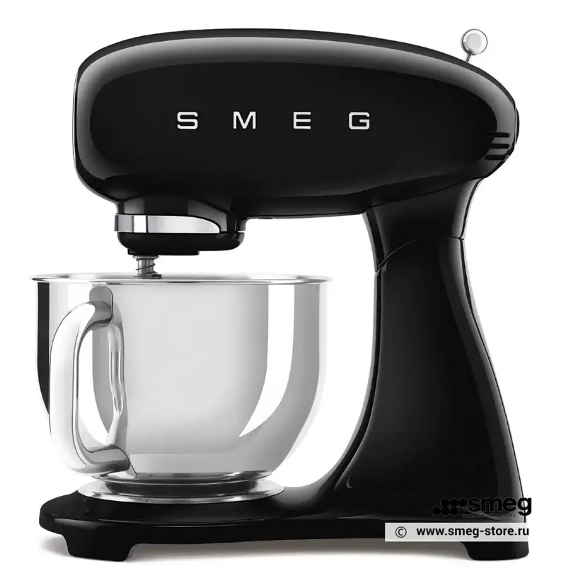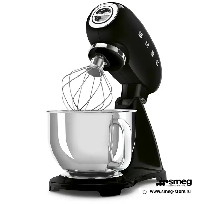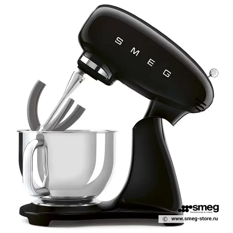 В верхней части корпуса Smeg SMF03BLEU расположен удобный рычаг для переключения десяти скоростей. Миксер поставляется с четырьмя насадками: 2 венчика, лопатка и крюки для теста. Высокая скорость и качество смешивания ингредиентов гарантирует планетарная система вращения.