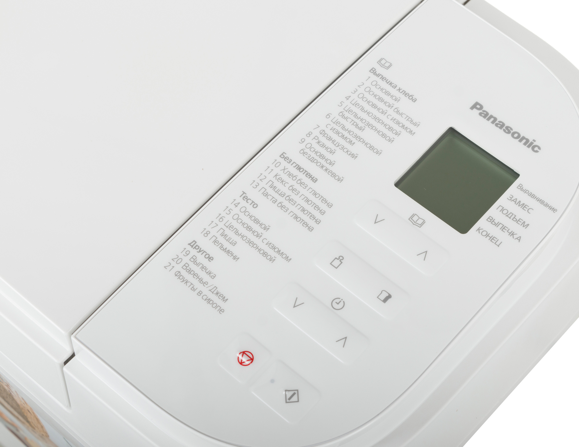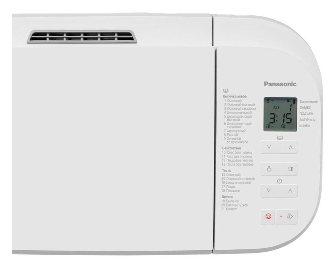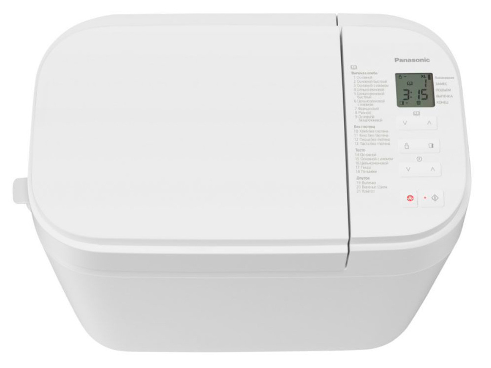 | Программы выпечки | Основной. Основной быстрый. Основной с изюмом. Цельнозерновой. Цельнозерновой быстрый. Цельнозерновой с изюмом. Французский. Ржаной. Основной бездрожжевой. Хлеб без глютена. Кекс без глютена. Пицца без глютена. Паста без глютена. Выпечка. Варенье/Джем. Фрукты в сиропе. | |