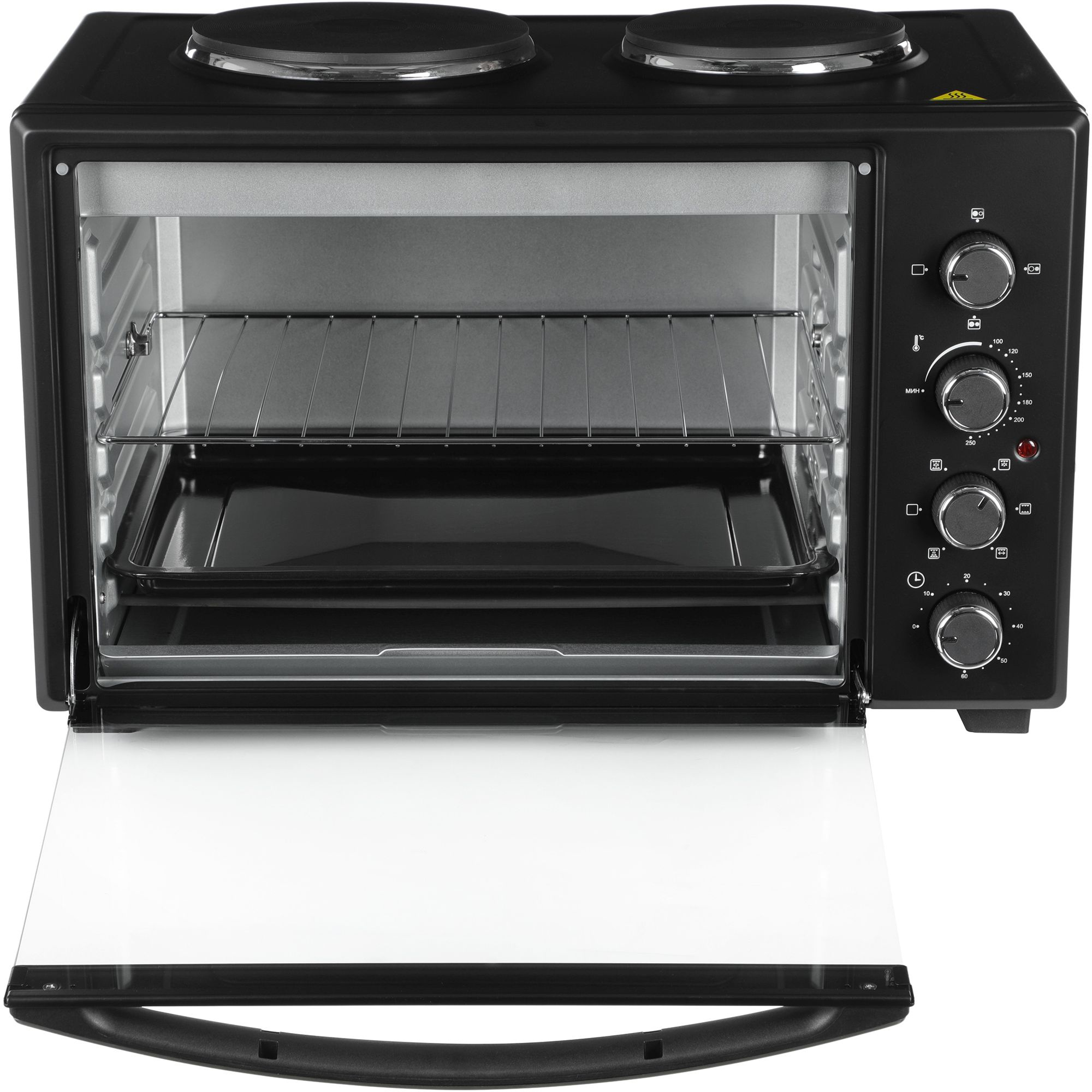 Особенности две конфорки 1000 Вт и 600 Вт, печь две конфорки 1000 Вт и 600 Вт, печь может работать одновременно как мини-печь, используя все функции, так и конфорки. Большая ручка из нержавеющей стали.