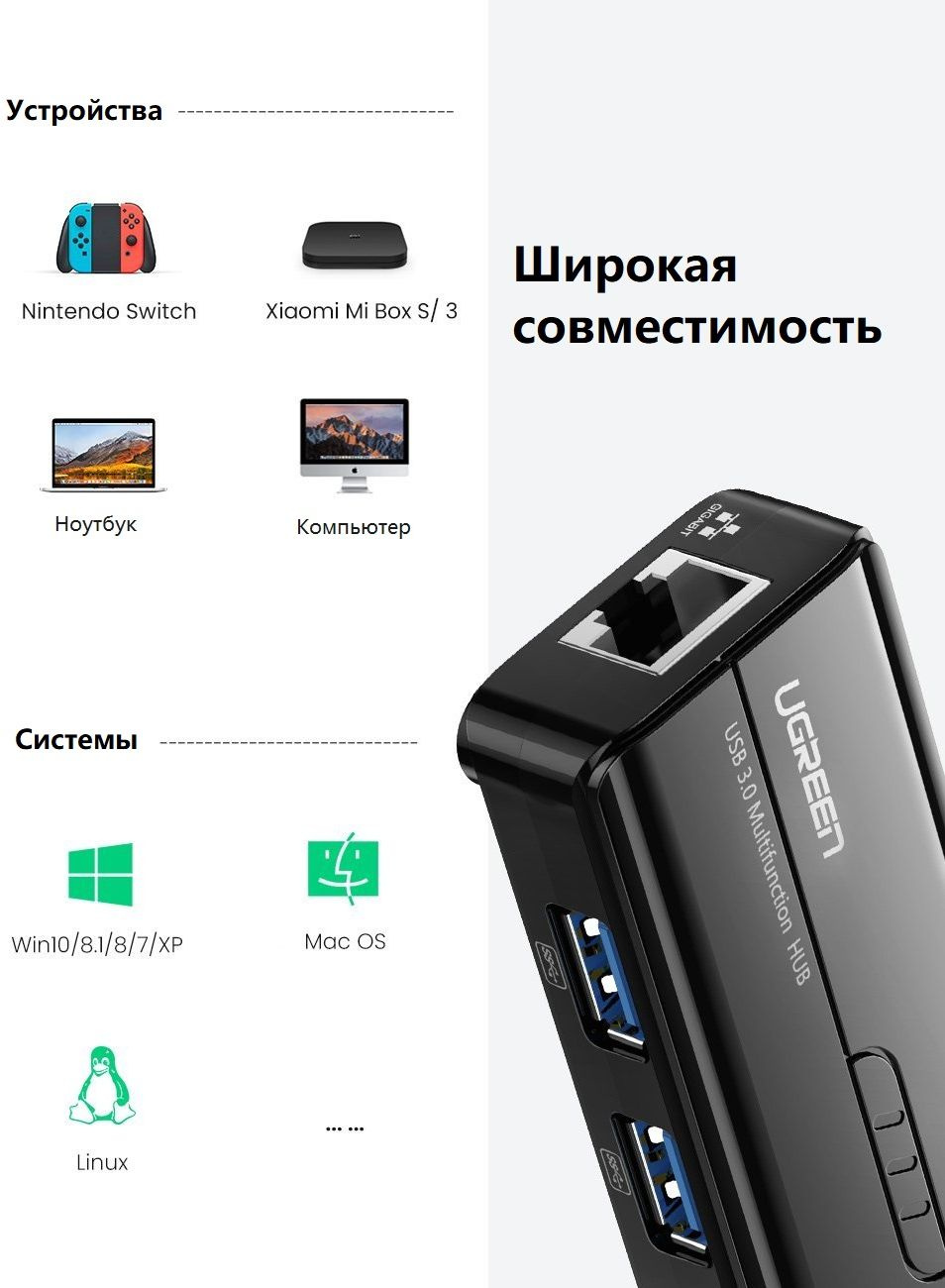 | Особенности | USB-хаб Ethernet позволяет подключать к вашему ПК или ноутбуку до 3 устройств с поддержкой USB A, например, внешний жесткий диск, USB флэш-накопитель, мышь, клавиатуру, USB наушники, динамики, USB камеру и т. д. | |