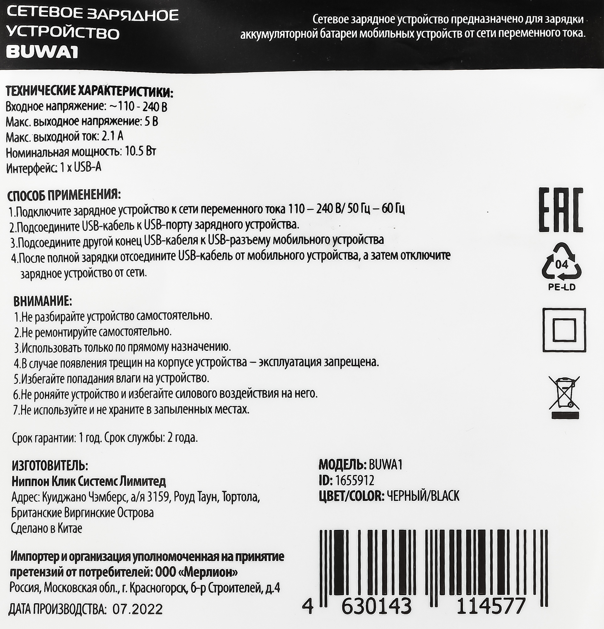 Описание Универсальное сетевое зарядное устройство с выходом USB-A с максимальной силой тока 2.1 А, позволяющее заряжать мобильные устройства разных производителей.