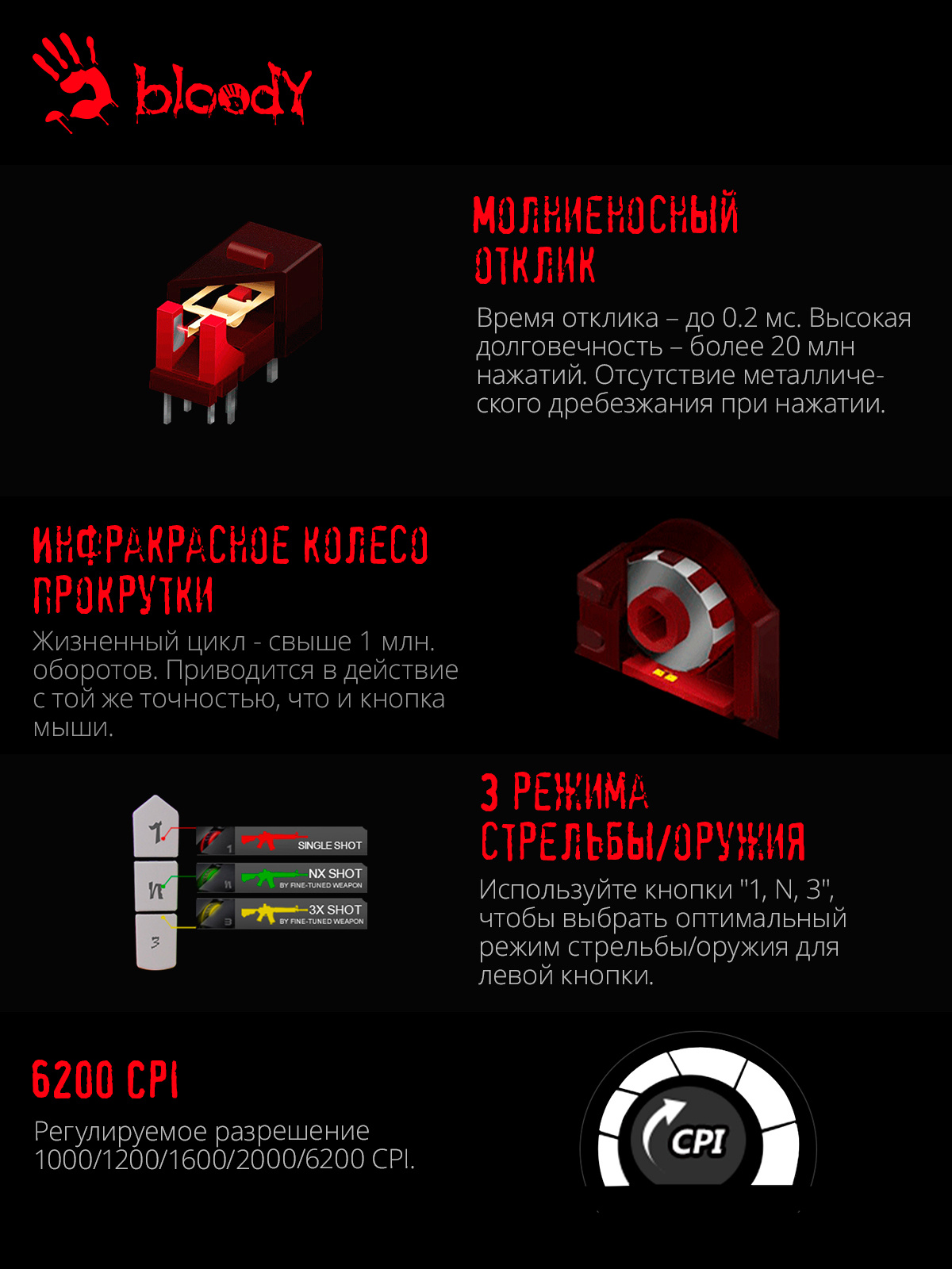 | Особенности | Молниеносный отклик. Время отклика – до 0.2 мс. Высокая долговечность - более 20 млн нажатий. Отсутствие металлического дребезжания при нажатии. Используются переключатели LK. Подсветка рисунка Neon. Игровой сенсор Pixart PMW3327. поддержка функции Drug click | |