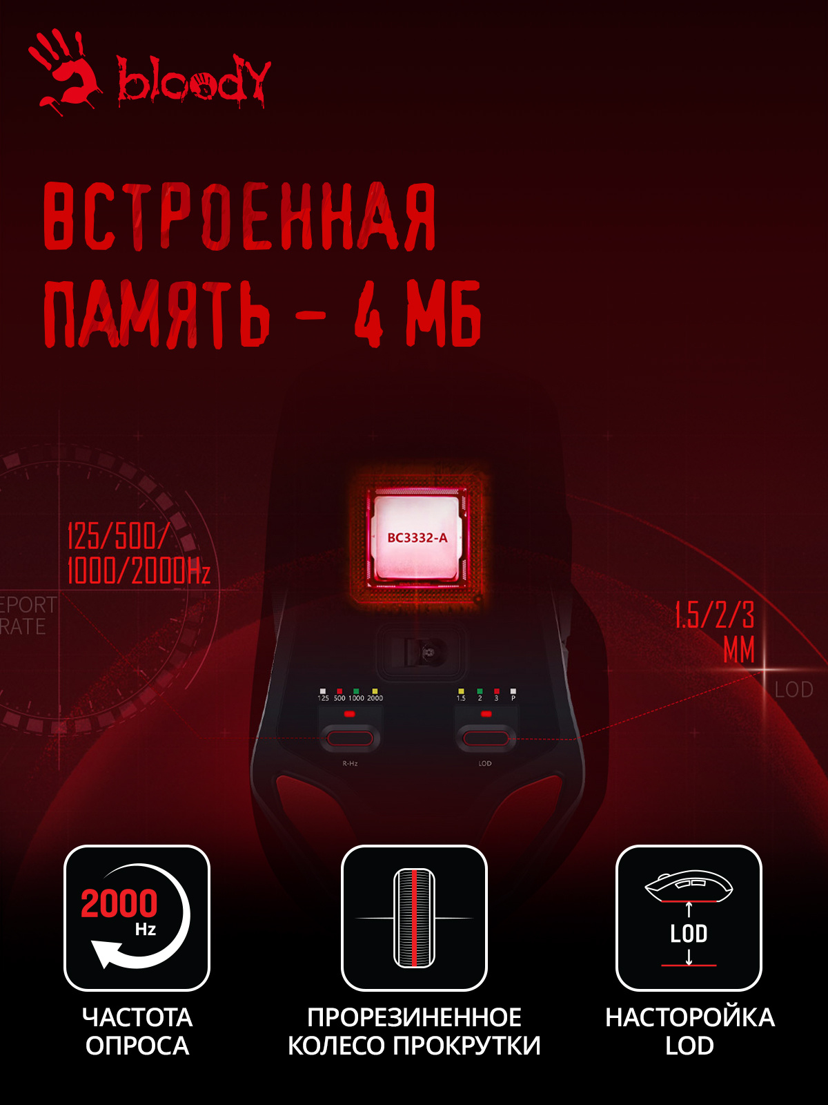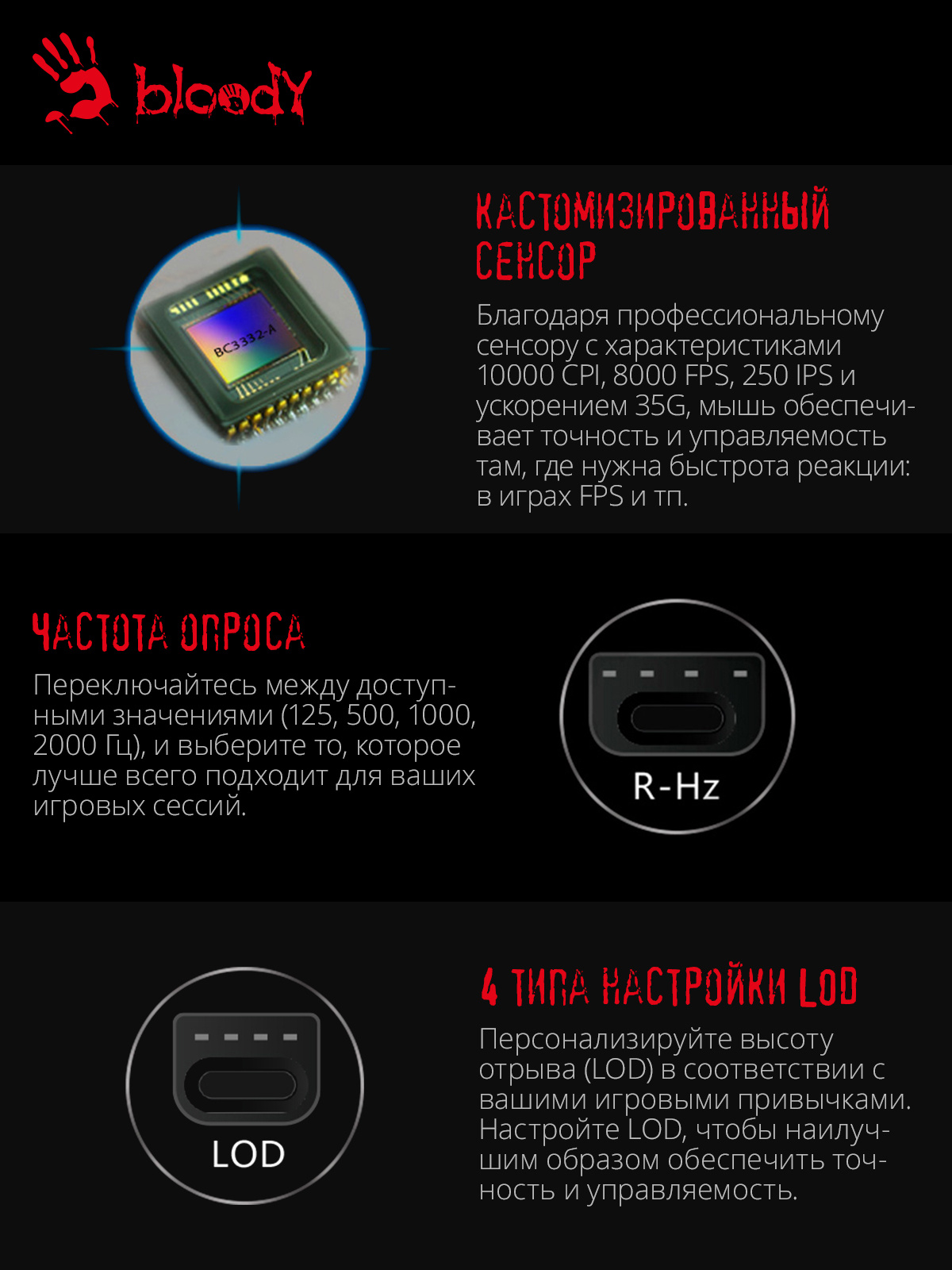 | Особенности | Кастомизированный игровой сенсор MAX BC3332-A 10K, 8000 FPS, 250IPS, регулируемая высота отрыва, 5 профилей подсветки RGB, 3 режима стрельбы / оружия, время отклика: 1 мс, металлические ножки. при установке ПО Bloody7, уровни core3,4 активированы бесплатно | |