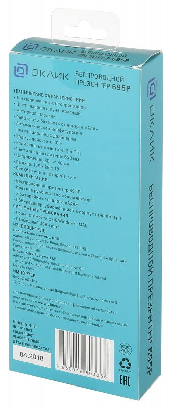 | Описание | Предназначен для управления показаом слайдов. Радиосвязщсь на частоте 2,4 ГГц. Частота волны лазера 650 нм. Имеется компактны USB-ресивер, убирющийся в корпус. СОвместимость с ОС Windows и MAC. Свободный USB порт. | |