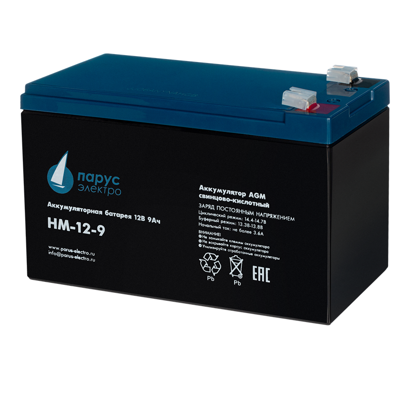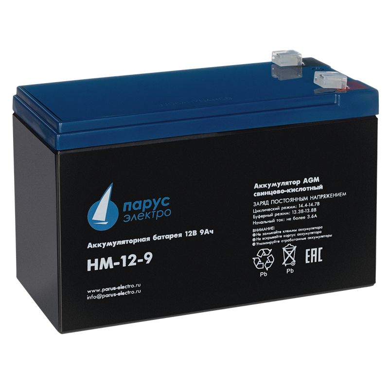 Свинцово-кислотные аккумуляторные батареи «Парус электро» серии HM изготовлены по технология AGM (электролит, связанный в стекловолоконном мате с дополнительными сепараторами), благодаря чему аккумуляторы практически не нуждаются в обслуживании, удобны в эксплуатации и имеют квалитативные разрядные характеристики. Применение решетки из свинцово-оловянно-кальциевого сплава позволяет изготавливать более легкие и прочные пластины. Электролиз воды на них начинается при более высоких напряжениях, а кристаллы, образующиеся в подобных пластинах, мелкие и однородные. Это снижает выброс водорода и продляет срок эксплуатации АКБ. Срок службы аккумуляторов серии HM ёмкостью от 5 Ач до 9 Ач составляет 6 лет, с ёмкостью от 12 Ач до 26 Ач - 6-8 лет, с ёмкостью от 33 Ач до 200 Ач - 10-12 лет.