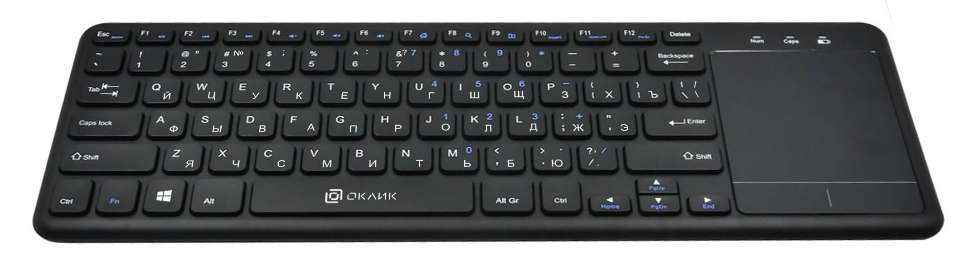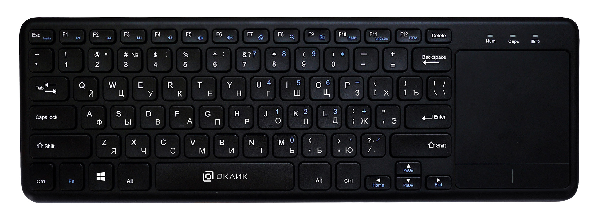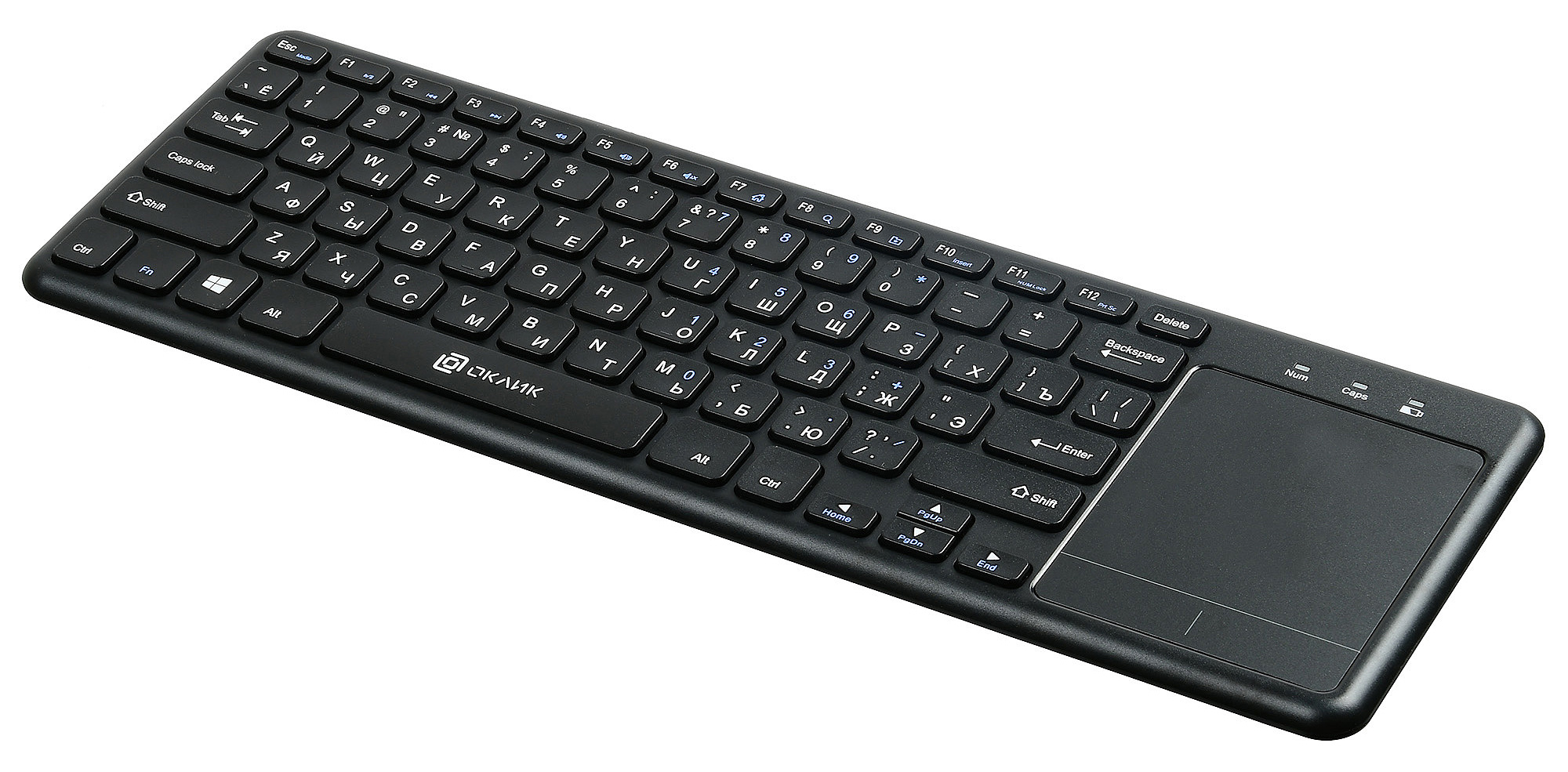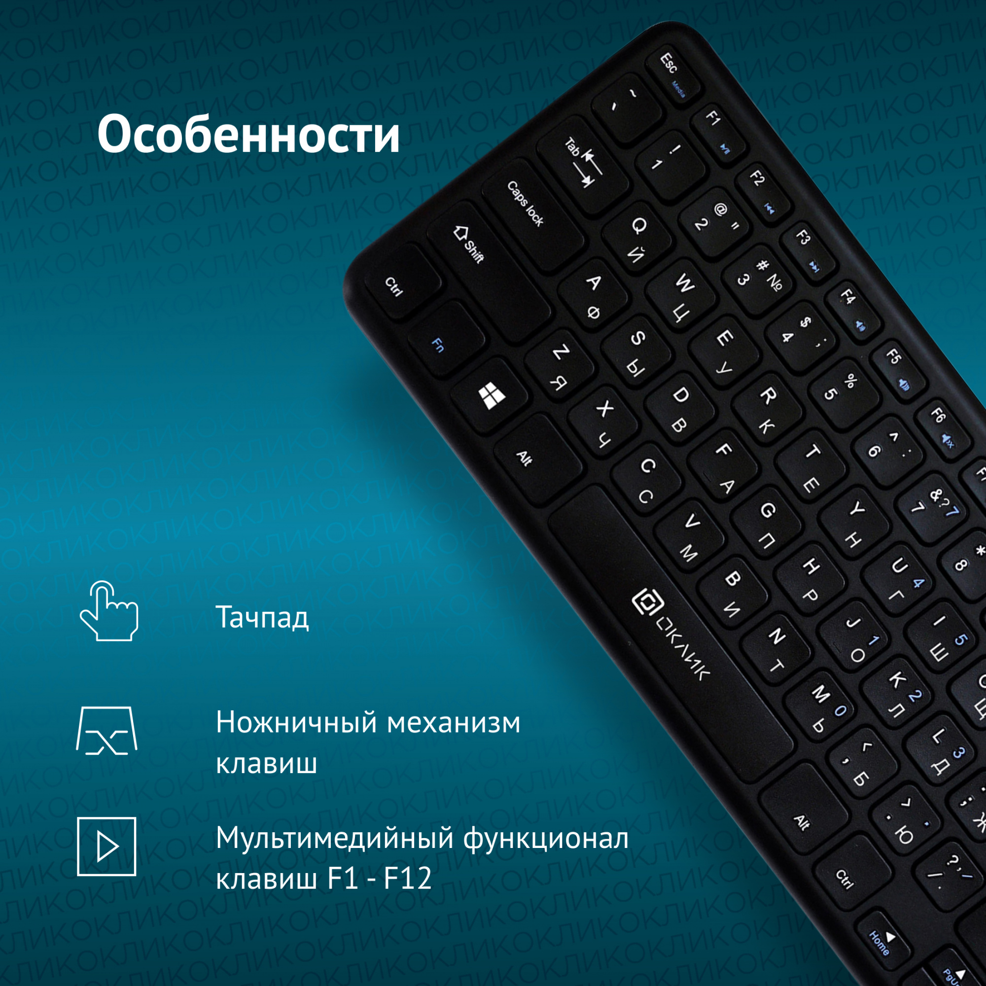 | Особенности | Беспроводная клавиатура с ножничным механизмом, тачпад, мультимедийные клавиши, функция Anti-Ghosting 6 клавишей, универсальная | |