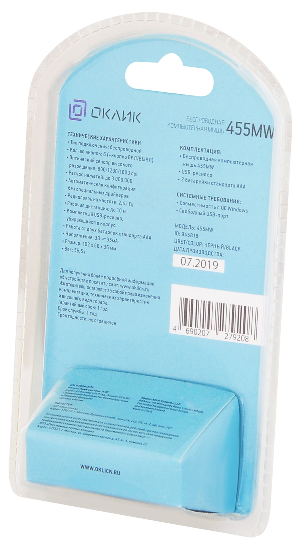 | Комплект поставки | Беспроводная компьютерная мышь 455MW, Компактный USB-приемник, убирающийся в корпус, 2 батарейки стандарта AAA | |