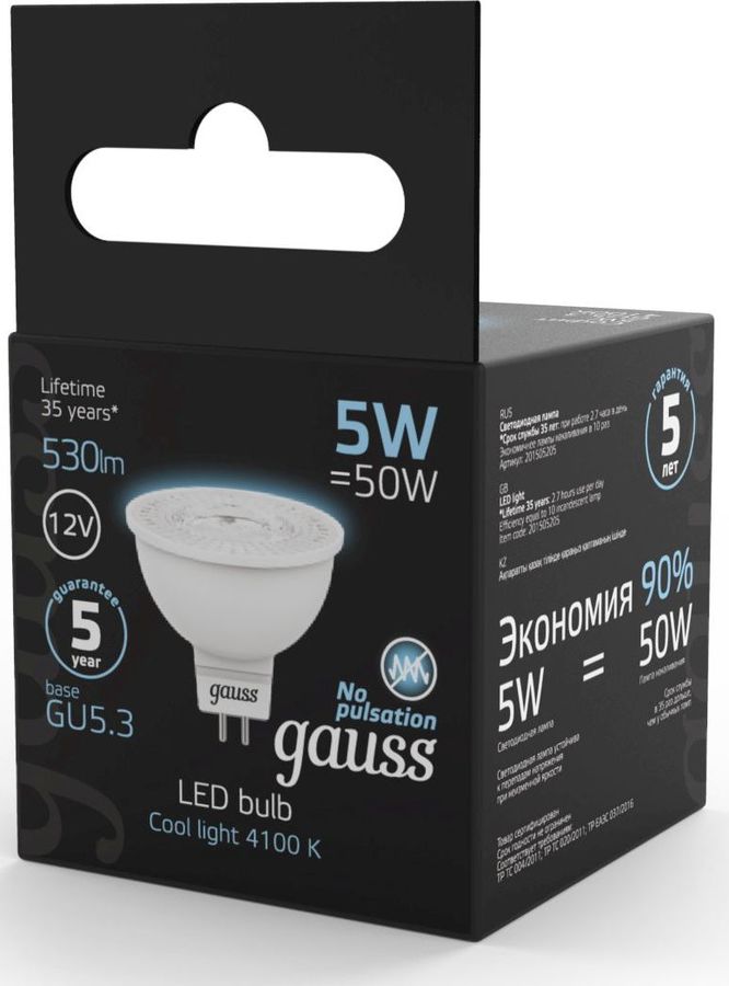 Описание Светодиодная лампа Gauss - безопасный для здоровья и окружающей среды источник света. Она не пульсирует, мгновенно включается, не содержит ртути и имеет больший срок службы, чем лампы накаливания и КЛЛ, экономичнее ламп накаливания до 10 раз.