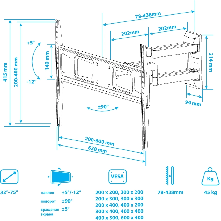 Кронштейн для телевизора Kromax CORBEL-11 титан 32"-75" макс.45кг настенный поворот и наклон