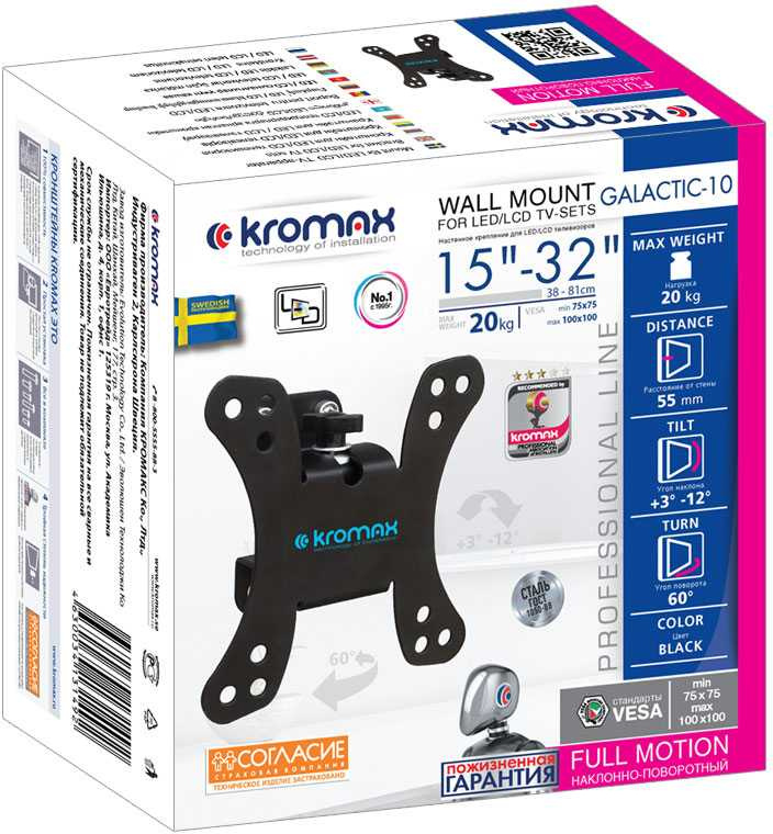 Описание Легкий монтаж при помощи съемной монтажной пластины. Надежная стальная конструкция. Универсальный телевизор на кронштейне можно наклонить, повернуть и сдвинуть к стене. Регулировка угла наклона без использования инструментов.