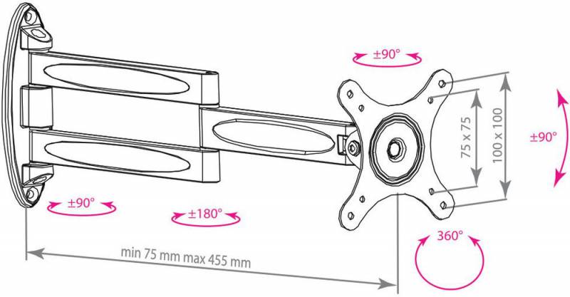 | Описание | Надежная алюминиевая конструкция. Универсальная система крепления. Кронштейн отодвигается от стены на 455 мм. Телевизор на кронштейне можно наклонить, повернуть и сдвинуть к стене. | |