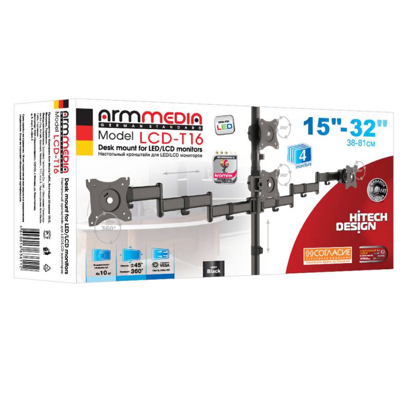 Описание Универсальное настольное крепление с горизонтальным размещением 4 мониторов. Два варианта установки на столешницу: за край стола и на поверхность стола. Кабель-каналы.