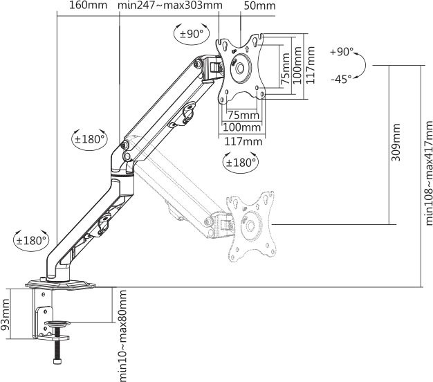 | Угол наклона | -90/+45 | |