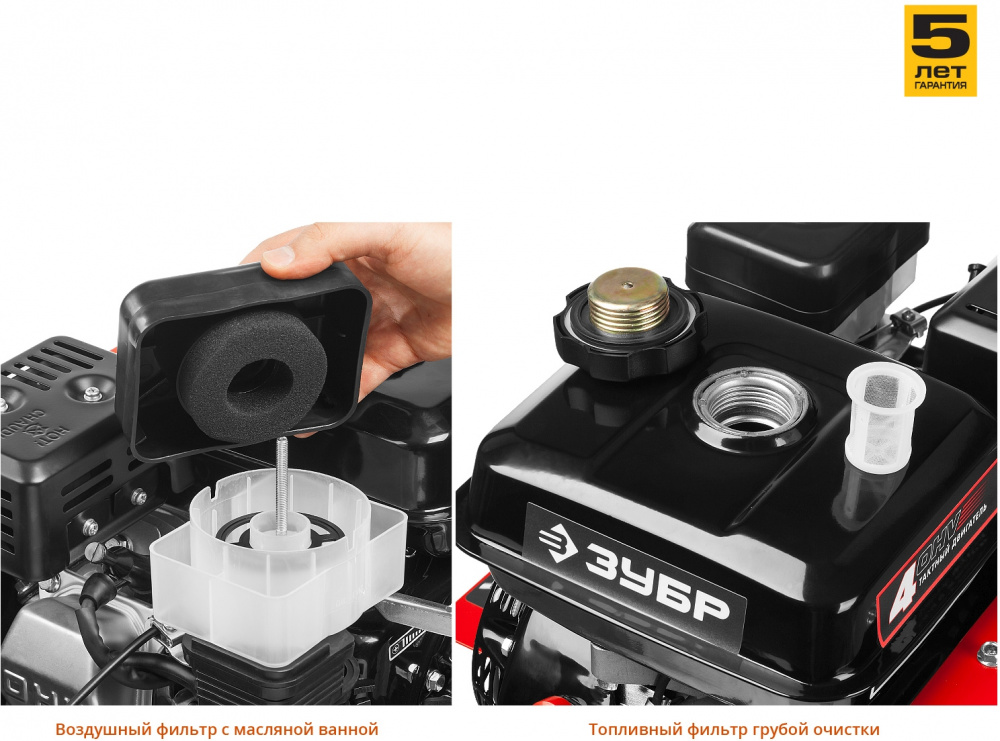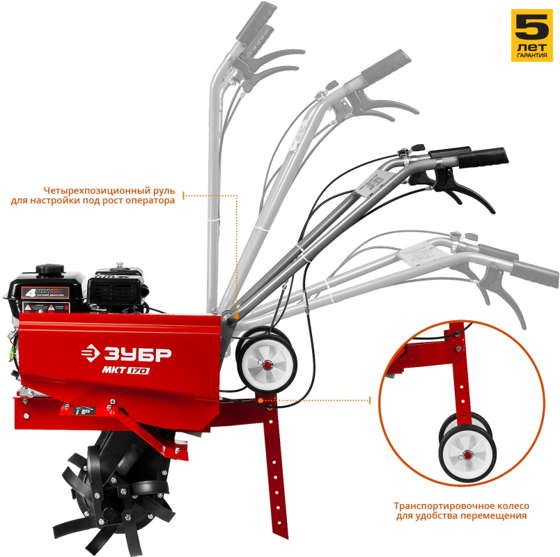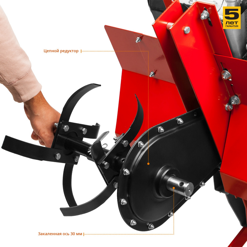 | Особенности | Прорезиненные ручки - для надежного хвата; 4-х тактный двигатель - для качественной работы; Регулировка руля под рост оператора - для удобства; Сошник - для регулировки глубины вспахивания; Реверс - для вытаскивания застрявшего культиватора. | |