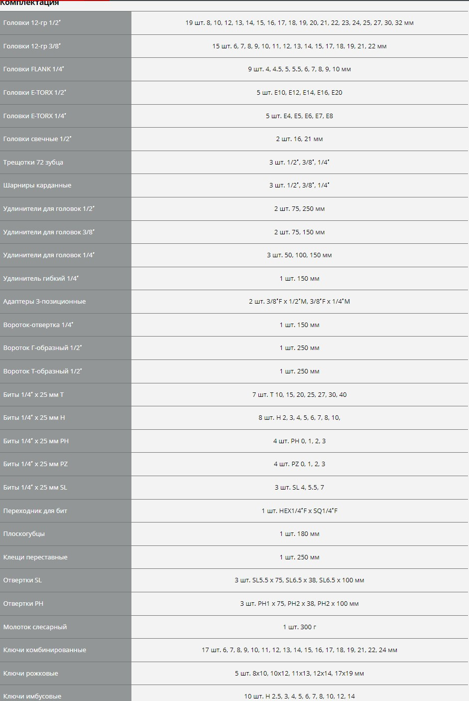 | Головки 1/2"DR, список | Головки 12-гр 8, 10, 12, 13, 14, 15, 16, 17, 18, 19, 20, 21, 22, 23, 24, 25, 27, 30, 32 мм Головки E-TORX E10, E12, E14, E16, E20 Головки свечные 16, 21 мм | |