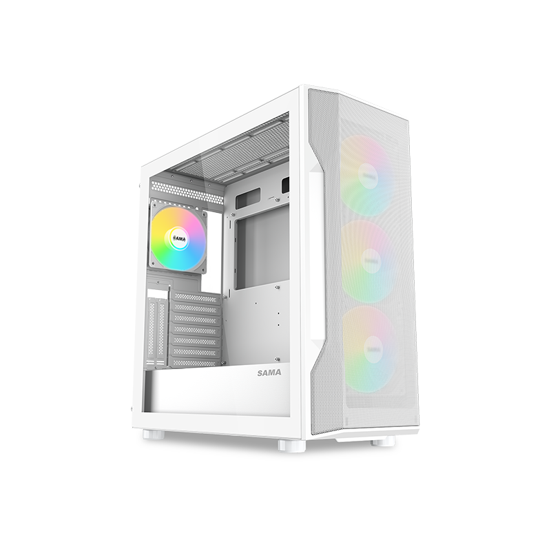 Корпус SAMA S40, оснащенный большой сетчатой передней панелью b четырьмя предустановленными высокопроизводительными вентиляторами ARGB, обеспечивает мощное охлаждение и демонстрирует потрясающие световые эффекты..