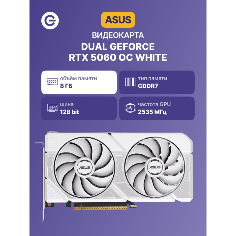 Видеокарта Asus Dual RTX5060 (90YV0N15-M0NA00), цвет корпуса белый с объемом видеопамяти DDR7, равным 8 Гб, разработана для игр в разрешении Full HD, решения задач искусственного интеллекта и работы в производительных графических приложениях. Модель с интерфейсом подключения PCIe 5.0 x8 и дополнительным питанием 8-pin занимает в корпусе 2,5 слота и поддерживает до четырех мониторов. Монтажный кронштейн из нержавеющей стали марки 304 обеспечивает надежность и долговечность конструкции. Рекомендуемая мощность блока питания — 550 Вт.