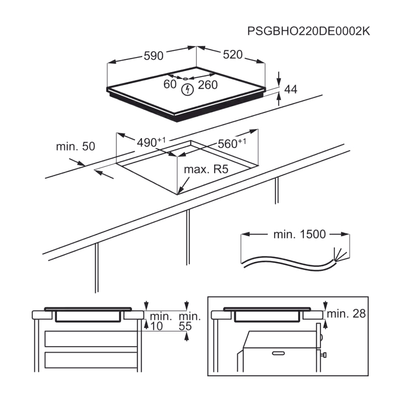 Независимая установка позволяет разместить панель в любом удобном месте кухни. Компактные размеры (59×52 см) делают её подходящей для кухонь различной площади. Высота панели составляет 4,4 см, а размеры для встраивания — 56×49 см.