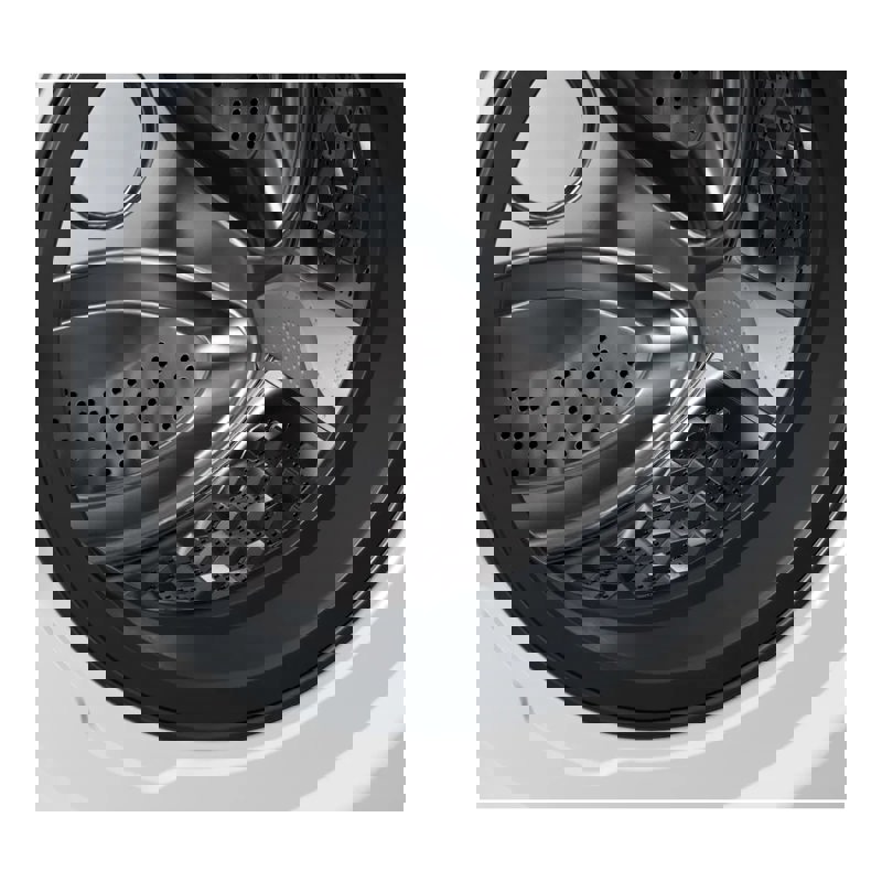 Модель выполнена в элегантном белом цвете с серебристой панелью управления и контрастной чёрной дверцей. Оснащена фронтальной загрузкой, вместимостью до 8 кг белья и барабаном объёмом 54 литра из нержавеющей стали. Диаметр загрузочного люка составляет 33 см, а дверь открывается влево.