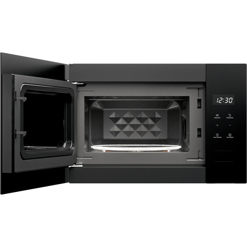 Ключевой особенностью модели является полностью сенсорная панель управления. Отсутствие выступающих переключателей не только подчеркивает минималистичный дизайн, но и значительно упрощает уход: ровную стеклянную поверхность достаточно протереть салфеткой. Интуитивно понятные иконки позволяют легким касанием выбрать необходимый уровень мощности или активировать функцию разморозки, а цифровой дисплей наглядно отображает оставшееся время.