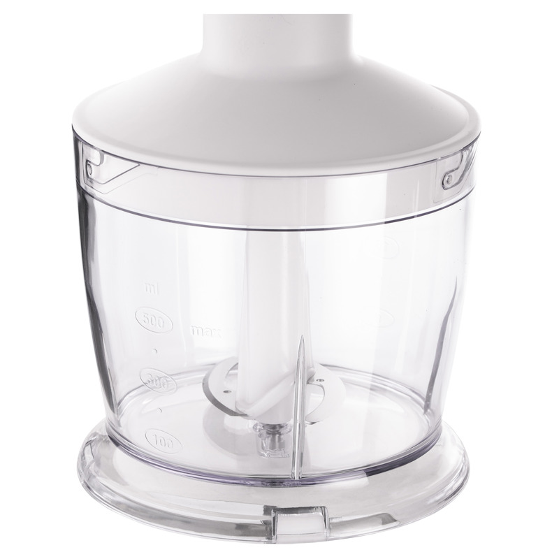Объём чаши - 500 мл, что удобно для небольших порций. В комплект входят три насадки: классический блендер для пюре и супов, измельчитель для орехов и овощей, а также миксер для взбивания кремов и теста. Это делает устройство универсальным и подходящим для самых разных рецептов.