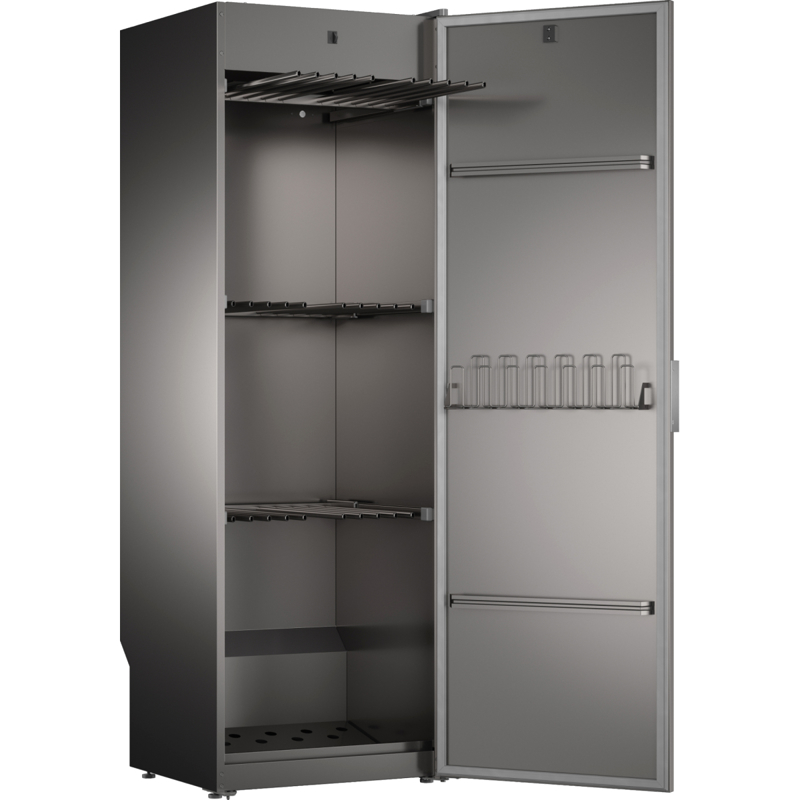Управление шкафом осуществляется с помощью современной электронной панели, оснащённой цифровым дисплеем и тактильными кнопками. Пользователь может легко выбирать программы, устанавливать температуру и время, а также отслеживать этапы процесса сушки благодаря наглядной индикации. Дисплей отображает оставшееся время, выбранные параметры и диагностические сообщения, делая эксплуатацию максимально простой и понятной.