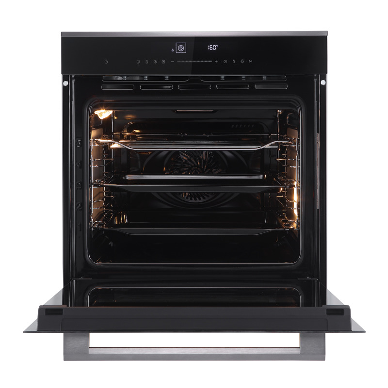 Объём духовки составляет 72 литра, что позволяет готовить большие порции или несколько блюд одновременно. Телескопические направляющие на одном уровне обеспечивают удобство и безопасность при извлечении тяжелых противней.