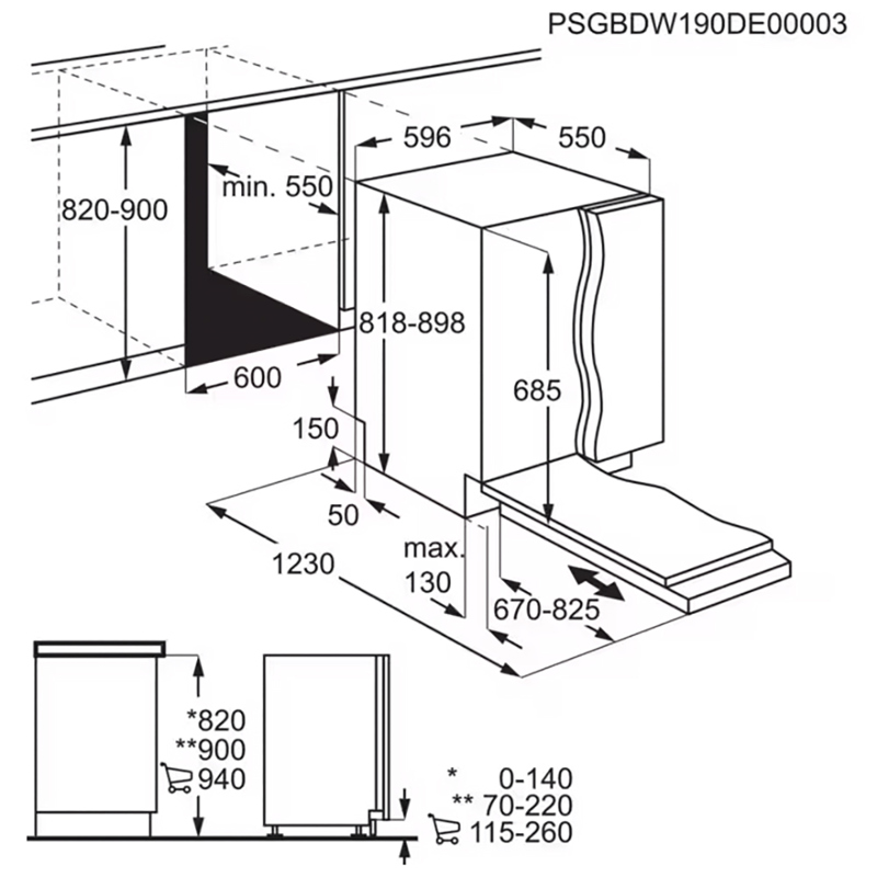 Размеры устройства составляют 59,6 × 55 × 82 см, что обеспечивает удобное размещение в стандартной нише встраиваемой техники.