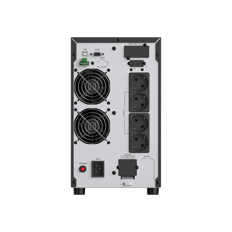 ИБП оснащен 4 розетками Schuko и дополнительным выходом TB (Terminal Block) для гибкого подключения к стационарной нагрузке. Стандартный входной разъём IEC C14 позволяет легко подключить устройство к электросети. Интерфейсы HID-USB, RS232, слот для SNMP и функция EPO обеспечивают удобное управление и удалённый мониторинг.