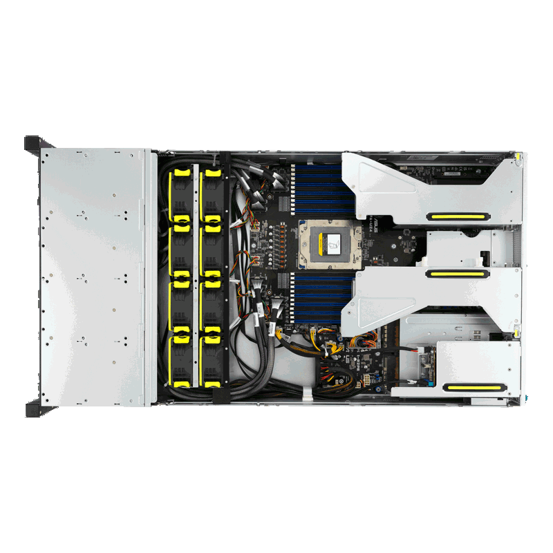 В основе сервера — процессор SP5 LGA 6096 с тепловыделением до 360 Вт, обеспечивающий солидную вычислительную мощность. Система поддерживает 24 модуля оперативной памяти DDR5 с частотой до 6400 МГц, гарантируя высокую пропускную способность.