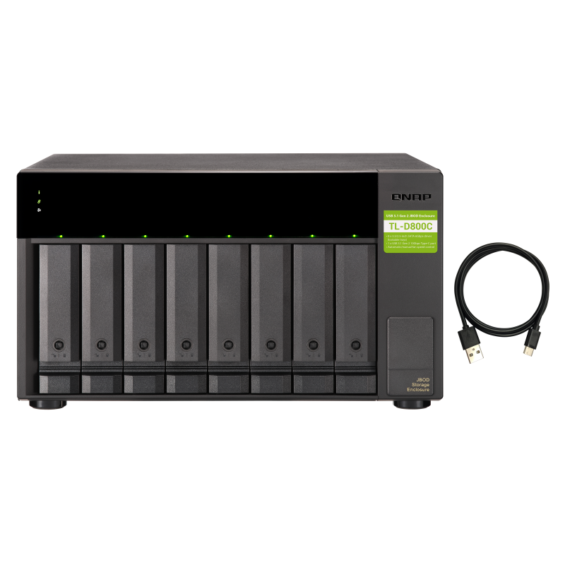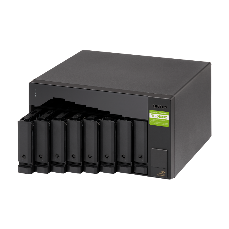 TL-D800C — модуль расширения емкости для сетевых накопителей QNAP, а также компьютеров Windows и Mac, и серверов. Модель выполнен в настольном исполнении, оснащен восьмью 3,5-дюймовыми отсеками для дисков SATA 6 Гбит/с и интерфейс подключения USB 3,2 Gen 2 (10 Гбит/с).
