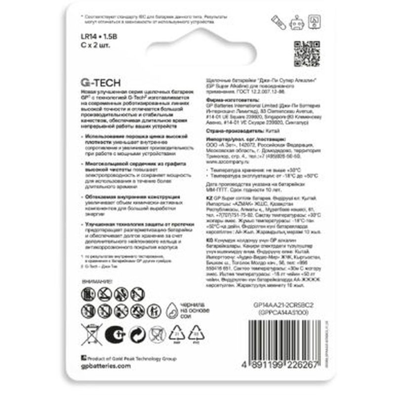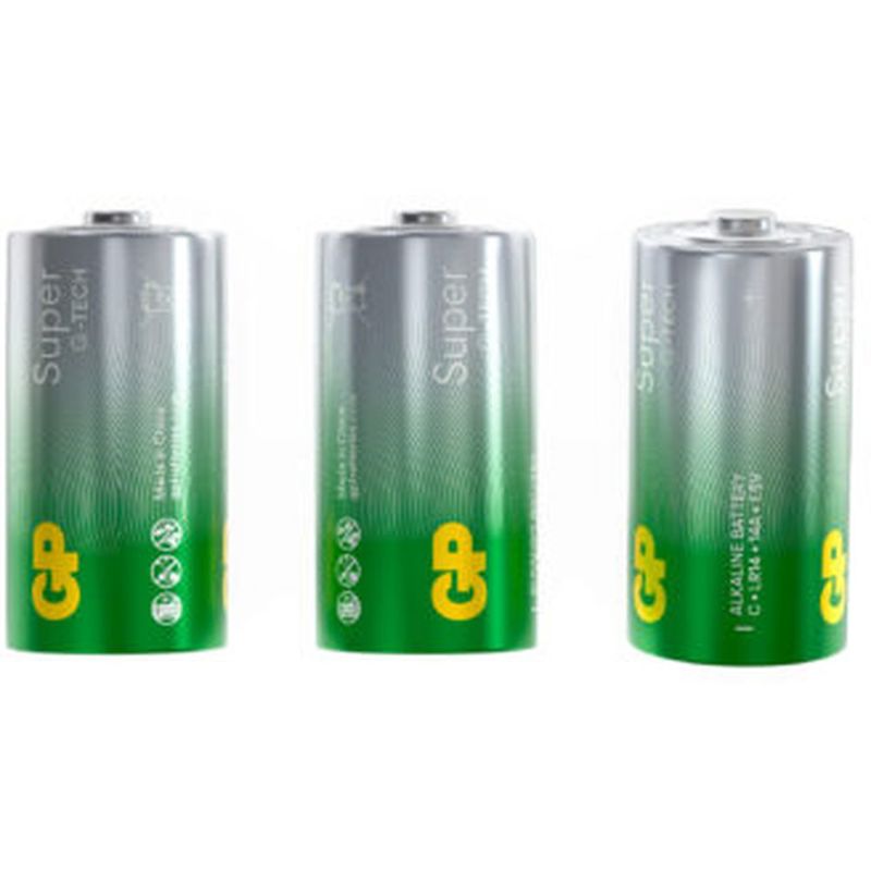 Батарейки GP Super Alkaline G-Tech 14А представляют собой алкалиновые элементы питания типоразмера C (LR14). Напряжение каждой батарейки составляет 1,5 В, что соответствует стандарту для данного типа элементов питания.