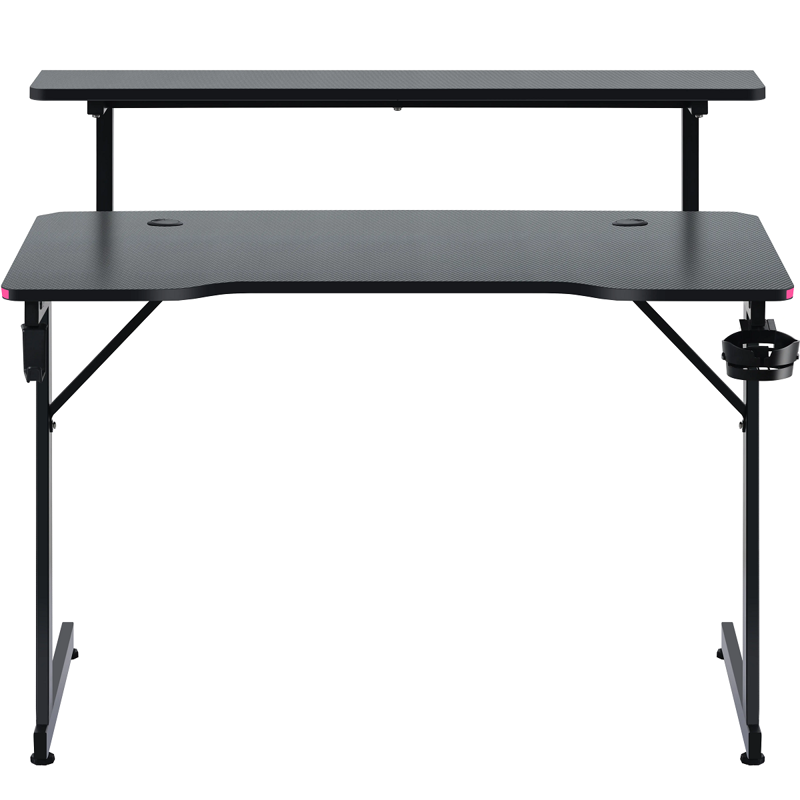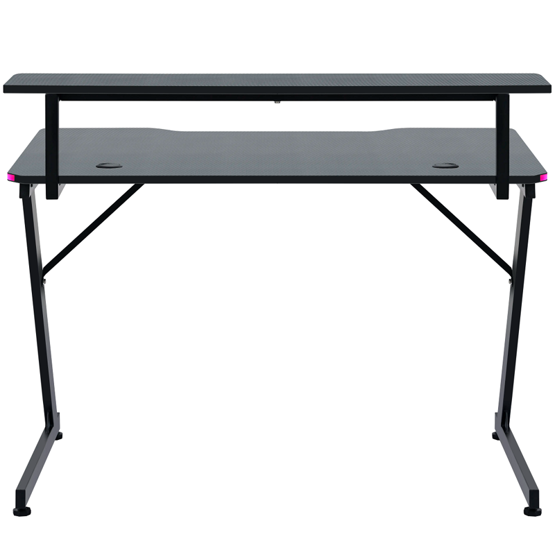 Удобный игровой стол с RGB подсветкой, полкой и с прочными металлическими ножками. Столешница выполнена из МДФ и покрыта прочной меламиновой пленкой с текстурой "под карбон". В комплект входят держатели для гарнитуры и кружки, в столешнице предусмотрены 2 выхода для проводов. Длина столешницы 110 см.