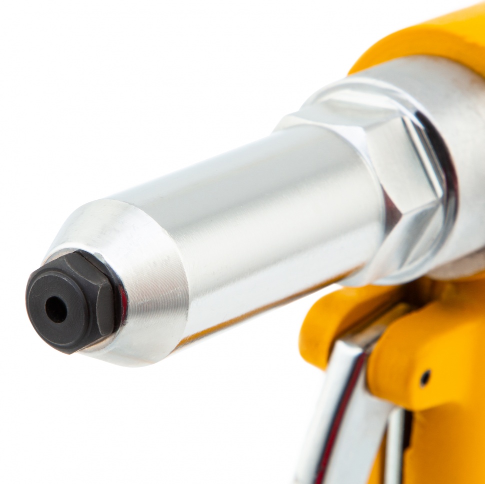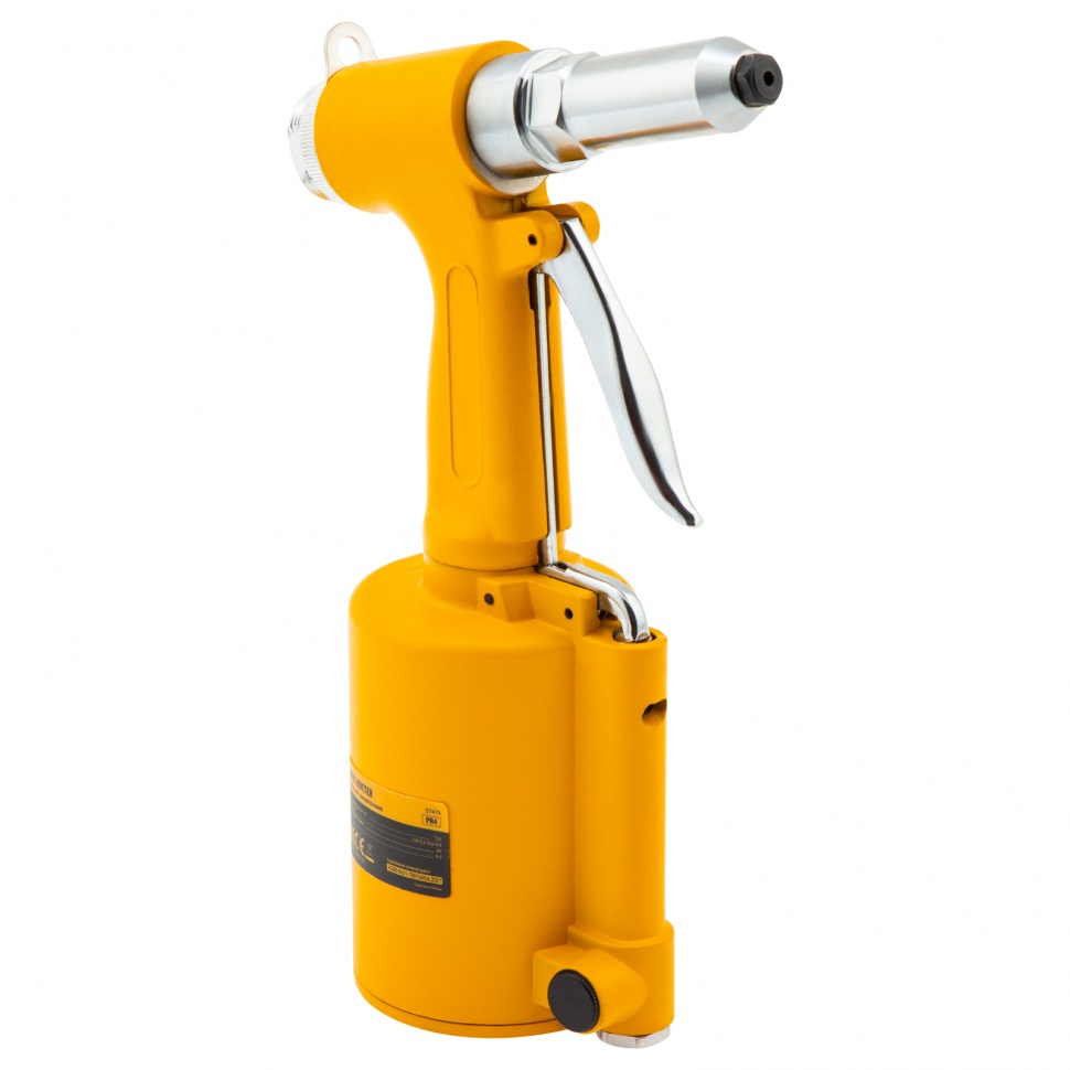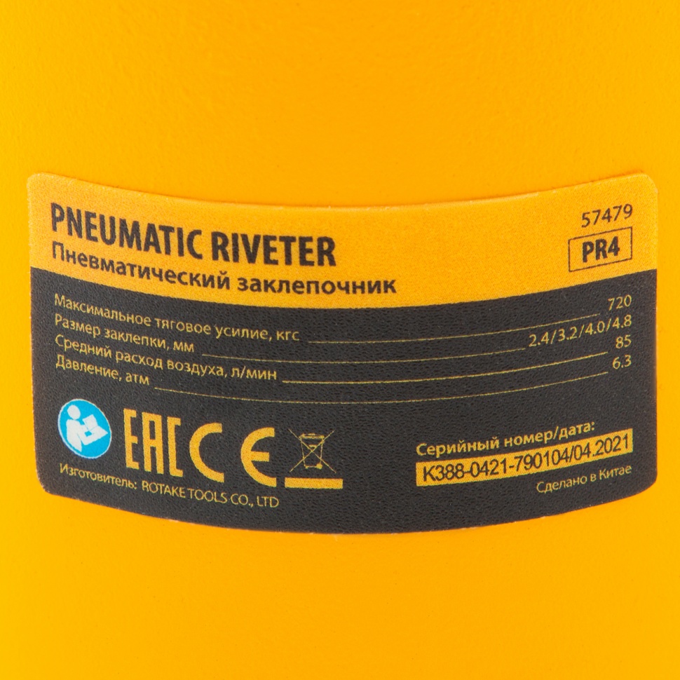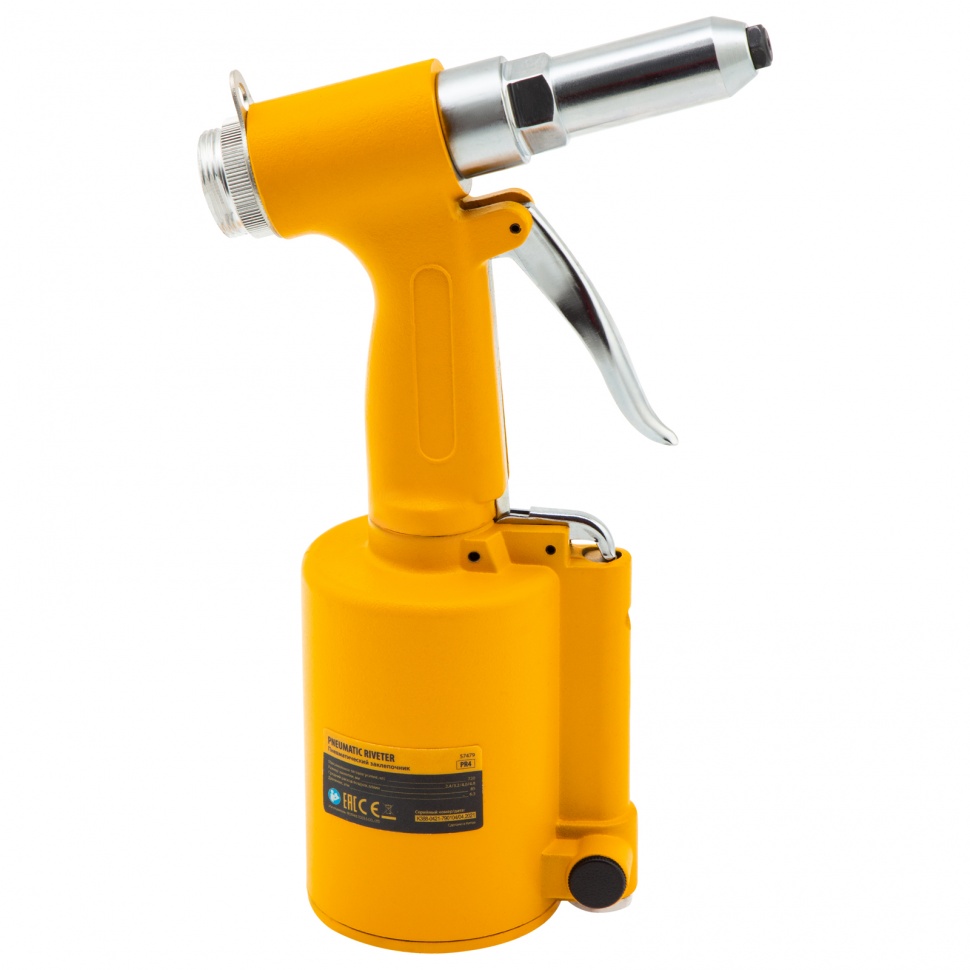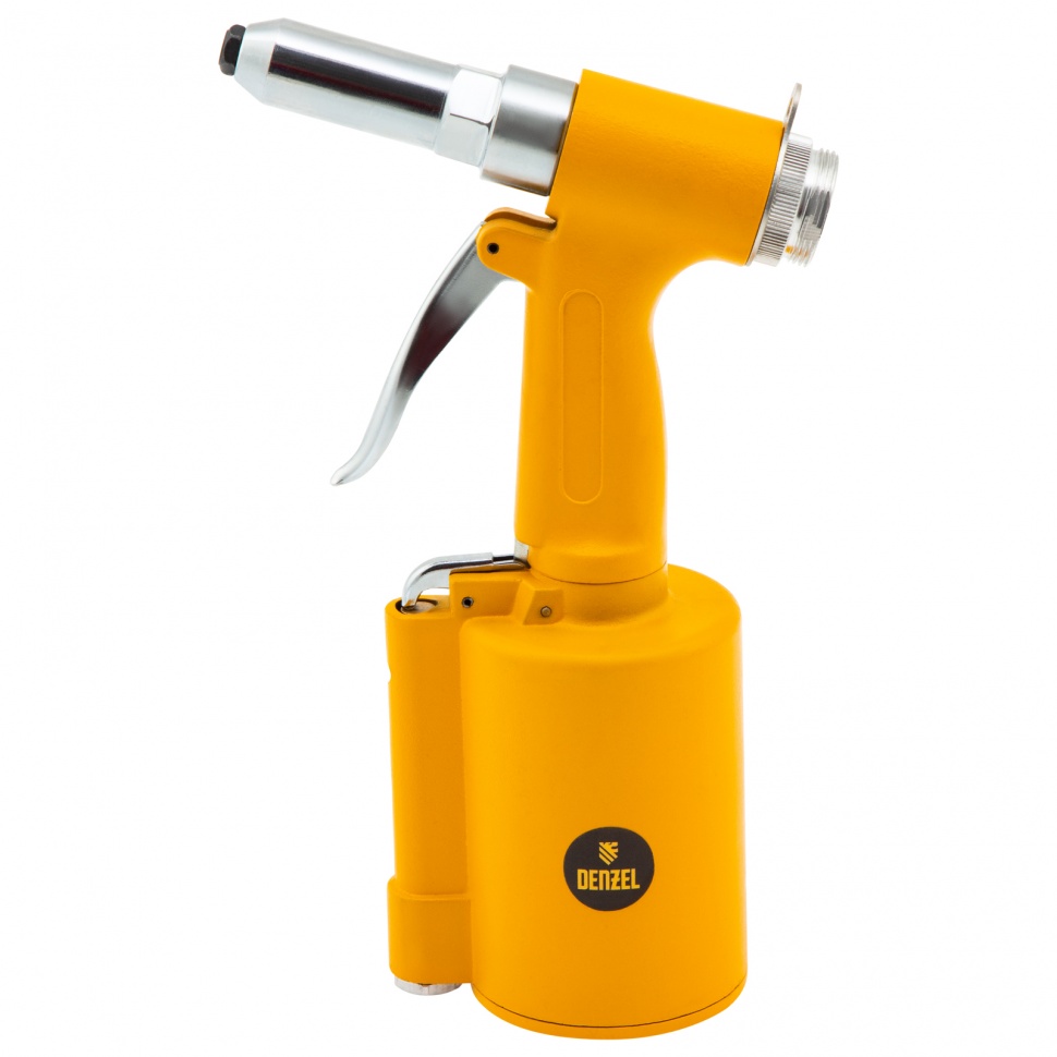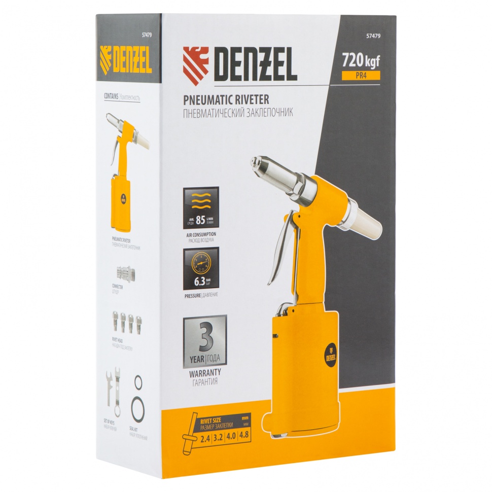 Пневматический заклепочник Denzel PR4 57479 значительно упрощает работу в автосервисах, домашних мастерских, на малых предприятиях и на ремонтных площадках. С его помощью можно без усилий скрепить листовой, профильный и панельный материал из пластика и металла.    Пистолет для вытяжных заклепок работает под давлением 6,3 АТМ и расходует всего 85 литров воздуха в минуту, поэтому для него подойдет компрессор средней мощности. В качестве оснастки используются заклепки размером 2,4-4,8 мм. В комплект поставки входит 4 насадки под заклепки размерами 2,4 мм, 3,2 мм, 4 мм и 4,8 мм.Преимущества    Долговечность — за счет простой и крепкой конструкции заклепочник обладает повышенной износостойкостью.    Безопасность — конструкция пневмоинструмента не имеет электроузлов, что исключает риск короткого замыкания.    Высокая работоспособность — воздушный двигатель не чувствителен к перепадам температур, перегрузкам или перегреву, поэтому способен работать длительное время без потери эффективности.    Лоток для отработанных заклепок — специальный контейнер помогает поддерживать рабочую площадку в чистоте.    Комфортная работа — прорезиненный корпус и ручка эргономичной формы обеспечивают надежное удержание инструмента.    Низкий уровень вибраций — в сравнении с электрическими моделями этот показатель значительно ниже, что минимизирует вредное воздействие на пользователя.    Небольшой вес — пневмозаклепочник PR 4 весит всего 1,4 кг и не оказывает сильной нагрузки на руки, что особенно важно при длительных работах.    Готовность к работе — к инструменту прилагаются штуцер для подсоединения к компрессору, ключ и набор уплотнений, поэтому использовать его можно сразу после приобретения.    Гарантия 3 года — качество инструмента подтверждено производителем.
