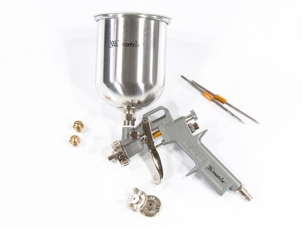 Пневматический краскораспылитель Matrix 57315 с верхним бачком объемом 1,0 л и соплами диаметром 1,2, 1,5 и 1,8 мм используется для окрашивания поверхностей и нанесения защитных составов. Он может работать с различными составами, такими как шпаклевка, лак и краска, т. к. в комплекте идет набор сменных сопел различного диаметра. Краскораспылитель пригодится в автосервисе или на стройке, а также на мебельном производстве для обработки дерева лаком.ПреимуществаВысокое качество работ — тип распыления MP позволяет получить среднее давление на выходе, обеспечивая равномерное окрашивание и снижение потерь краски.Обработка больших поверхностей — увеличенный бак объемом 1 л обеспечивает значительный запас рабочего раствора, что позволяет реже прерываться для заправки.Верхнее расположение бака — такое решение экономит время на заправку, а также позволяет использовать всю краску полностью.Использование красок на основе растворителей — алюминиевый бак выдерживает воздействие агрессивных сред.Долговечность — металлический пистолет устойчив к износу и механическим повреждениям.Настройка параметров работы — можно установить величину расхода краски и выбрать форму распыления в зависимости от материала и площади обрабатываемой поверхности.Малый вес 0,56 кг — руки не устают даже при длительной работе.