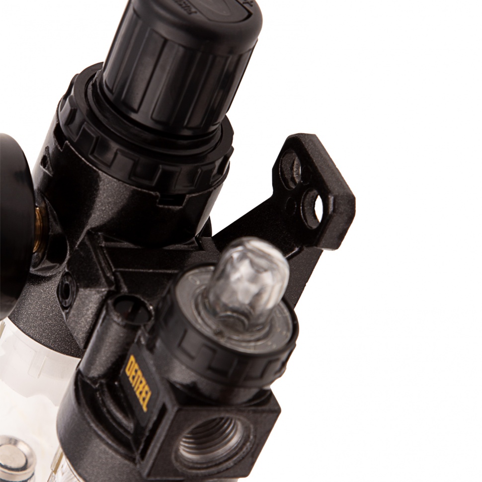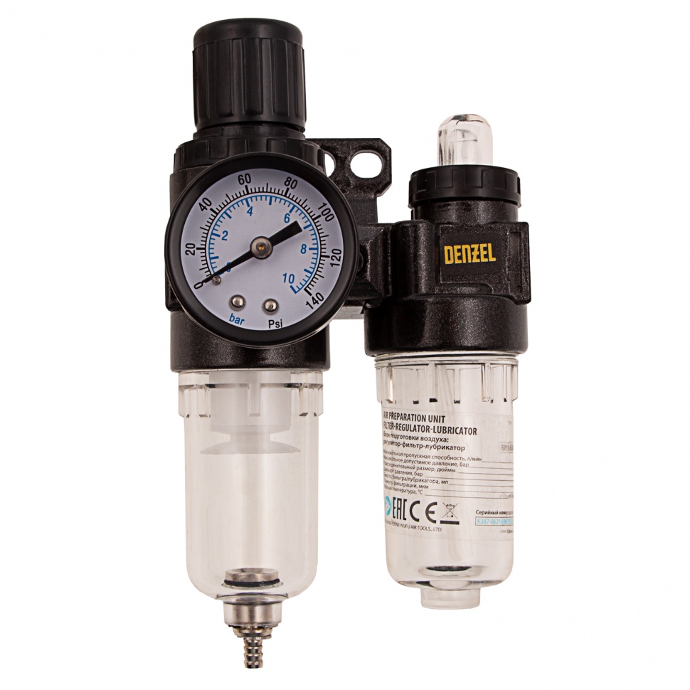 Блок подготовки воздуха Denzel FLR1500 57469 с фильтром-влагоотделителем, регулятором и лубрикатором, с присоединительным размером 1/4 дюйма, имеет пропускную способность 1500 л/мин, работает под давлением до 10 бар и позволяет увеличить срок службы пневматического инструмента.Регулятор со встроенным манометром помогает контролировать и поддерживать заданное давление для корректной работы пневмоинструмента. Фильтр предназначен для очистки сжатого воздуха от конденсата и посторонних частиц размером от 40 мкм. Лубрикатор служит для подачи масла к пневмоинструменту. Блок используется совместно с компрессорами на строительной площадке, в мастерской, на производстве, в автосервисе, пригодится также в гараже.ПреимуществаВместительная емкость лубрикатора — объем масла 25 мл позволяет снизить частоту заправок.Регулировка количества подаваемого масла — можно установить оптимальный режим в зависимости от подключенного инструмента.Простой монтаж — отверстия в корпусе блока позволяют закрепить его на стене.Качественный фильтрующий элемент — он изготовлен из полиэстера и отличается повышенной пылеемкостью, поэтому не нуждается в частой замене.Удобное обслуживание — корпус фильтра и лубрикатора из прозрачного пластика позволяет отслеживать степень загрязнения и количество масла.Сливной клапан — предусмотрен автоматический сброс скопившегося конденсата без участия пользователя.Гарантия 3 года — качество блока подготовки воздуха подтверждено производителем.