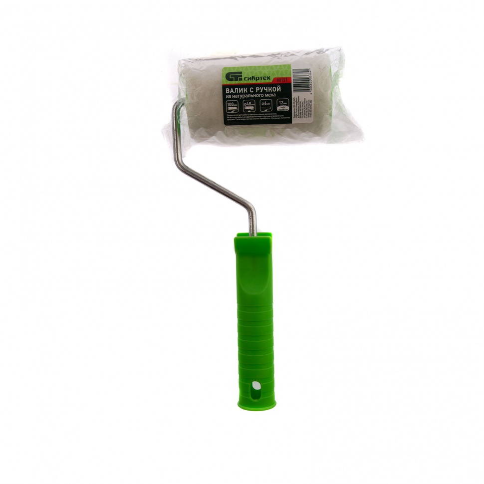 Валик с натуральным мехом Сибртех 80121, с ворсом 12 мм, ручкой 6 мм, диаметром ролика 48 мм и шириной 100 мм, позволяет работать с эмалями, масляными и водно-дисперсионными красками, а также защитными покрытиями. Благодаря длине ворса 12 мм валик подходит для окрашивания не только гладких, но и шероховатых поверхностей.ПреимуществаБыстросъемная система фиксации — ролик легко менять и чистить без рукоятки.Деформационная стойкость — фланцы приварены ультразвуком, поэтому конструкция выдерживает частый монтаж/демонтаж ролика.Высокая производительность — свободно вращающийся ролик не заедает в процессе работы, что облегчает покраску и обеспечивает максимальную отдачу ЛКМ на поверхность.Технология Termofusion — шубка прочно закреплена на ролике термическим способом и устойчива к разрыву, поэтому валик подходит для многократного применения.Оцинкованный бюгель — изделие надежно защищено от коррозии, имеет высокий рабочий ресурс.Ширина ролика 100 мм — можно производить малярные работы в труднодоступных местах.