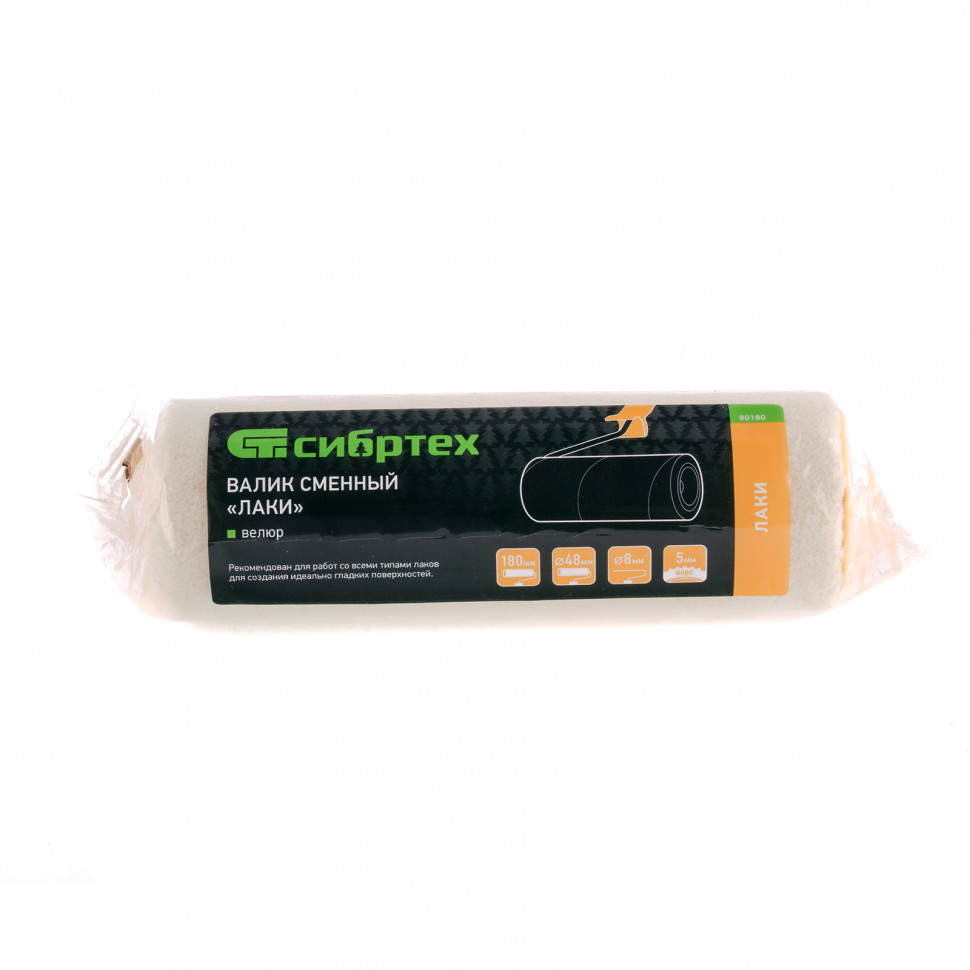Сменный валик Сибртех «Лаки» 80180 с ворсом 5 мм из велюра, роликом 180 х 48 мм, под ручку 8 мм, подходит к модели Сибртех 80178. За счет шубки из велюра с коротким ворсом он равномерно наносит материал тонким слоем, поэтому оптимален для малярных работ с лаками. Валик шириной 180 мм удобен для окрашивания больших площадей.ПреимуществаБыстрая установка — ролик имеет классическую конструкцию с трубкой внутри, что экономит время при подготовке к работе.Равномерное окрашивание — шубка с обработанными краями и бесшовной структурой не оставляет следов на поверхности.Возможность многократного использования — шубка надежно зафиксирована на ролике методом термического приклеивания.Эффективная и комфортная работа — надетый на бюгель валик свободно вращается, обеспечивая наивысшую отдачу лака или краски на поверхность.Надежность — валик изготовлен по технологии нового поколения Termofusion Coinjection, что повышает его ресурс и качество окрашивания.