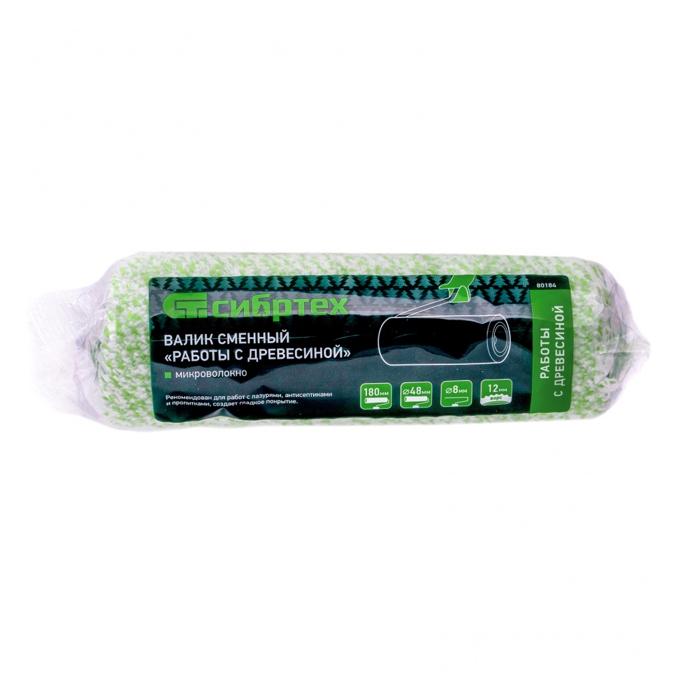 Сменный валик Сибртех «Работы с древесиной» 80184 шириной 180 мм, с ворсом 12 мм из микроволокна, диаметром 48 мм, подходит под ручку 8 мм. Он равномерно наносит на деревянный поверхности жидкие ЛКМ: антисептики, грунтовки, пропитки, защитные составы, лазурь и другие невязкие материалы. За счет ширины 180 мм валик оптимален для окрашивания больших поверхностей.ПреимуществаЭффективная работа — шубка из микроволокна отлично впитывает лакокрасочные материалы и позволяет наносить их ровным тонким слоем.Быстрая установка — валик имеет классическую конструкцию с внутренней трубкой, поэтому подготовка к работе не займет много времени.Равномерное окрашивание — шубка выполнена без швов, а ее края аккуратно острижены, поэтому валик не оставляет следов на поверхности.Высокий ресурс — термически приклеенная шубка не соскальзывает и не отслаивается от ролика, поэтому валик выдерживает многократное использование.Высокое качество — валик изготовлен с применением новейшей технологии Termofusion Coinjection.